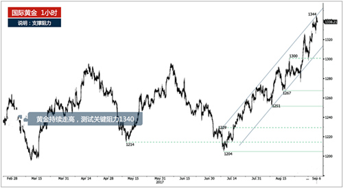 周一全球金融市场一大早就走了避险情绪,欧盘开盘之后,黄金持续拉升,最高触及1340一线。三胖动动嘴巴,签几个字,几个导弹下去,黄金一路高歌猛进。目前整个市场都是处于避险情绪催化之中,任何风吹草动都会带动黄金上行。但避险的弱点就在于其持续度,如果没有持续度,避险消退,黄金也会应声回调。而9月15日的缩表计划紧