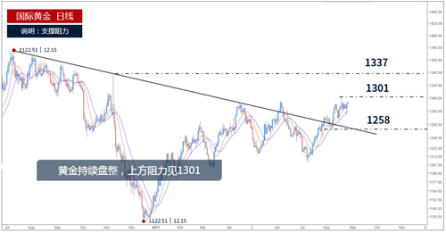 黄金从中长期角度来看,还是有希望开启牛市的,主要的推动因素就是美联储。由于上周五年会耶伦打太极,坚持不谈论涉及货币政策的话题,令投资者颇为失望,9月加息概率降至0%,12月加息概率也降到了34%。美联储谨慎的作风可能会放缓紧缩步伐,再次加息有望推至2018年。因此本周的非农数据就显的格外重要,美联储是否更快的进