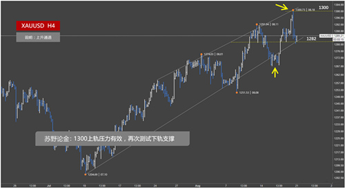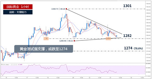 本周市场基本围绕全球央行年会这一话题运作,基本面稍显清淡,而对于行情方面就更加不用多提了。黄金价格从周初1285附近开盘,就一直处于区间震荡的行情当中,市场在年会前都趋近于平静,周一周三两天收阳,周二周四两天收阴,但是在周五年会到来之际,市场似乎把压抑了近一个星期的情绪全部宣泄出来,周五一波完美的过上车