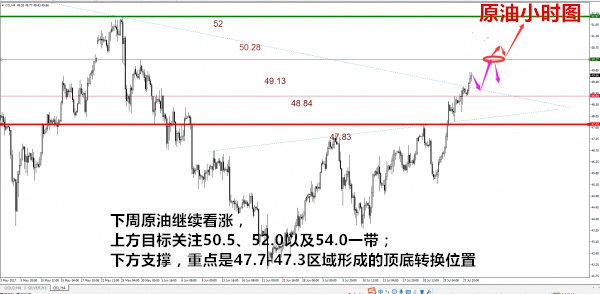 原油本周表现的十分抢眼,价格自本周一开始就展开了一周的反弹,日线成功录得五连阳,虽然在上周尾段油价一度大幅回调,但是笔者并未因为此次的下跌而轻易改变对趋势的判断,价格周初即收复跌势后后续屡创新高,周五价格更是逼近50关口,这也是笔者给出的第一目标点位,也是周三笔者给出的短中线多单目标点位,详情可查阅笔