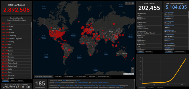 刚看到关于疫情的消息,上周好不容易发生了好转,没想到这两天全球确诊人数再创新高。看来散户们对市场的态度还是太乐观了。 我是希望疫情能早点过去,全球人民都能像我们一样恢复正常生活,不希望有人因为疫情离开。目前现实离我们的期望仍有些许距离。。 市场担心第二次爆发,下周黄金避险再次发酵! 截至北京时间4月26日7点31分,全球新冠肺炎确诊病例超过289万例,达2886408例,其中,美国确诊病例超93万例,达936293例。确诊人数处于历史新高 ! 1.这一刻我想很多人正为自己处在华夏大地而骄傲!纵观美国,民众担忧,正值特朗普重启经济之时,此时强行复工很大可能会带来疫情爆发。由于市场对疫情二次爆发