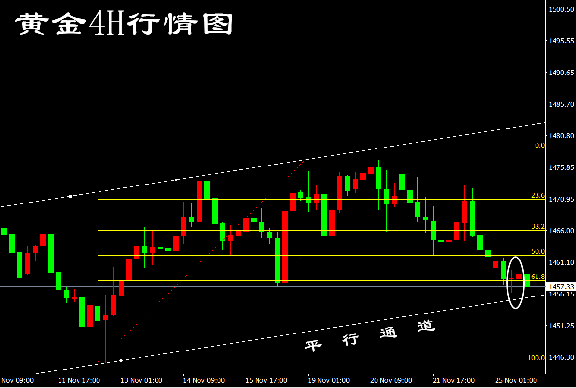 什么样的行情才是最难做的行情?明明看着行情在涨,可就是鼓不起勇气跟上节奏,总在反复究竟与犹豫中与你的利润失之交臂,除了一声叹息,什么都没有改变! 金价直逼1460,黄金转折是否来临? 转眼间到了十一月底,本周黄金还在震荡当中,不过值得坚信的是。一旦中美签署成功再加上USMCA会进一步利空黄金,11月中旬美联储不降息这个大概率事件同样是利空黄金,不过中间的技术调整需要避开。技术面短周期看,4小时上金价处于震荡回撤之势,MACD绿色动能柱略微扩大,指示黄金短线回撤动能有所强化,周初或还有一波回撤,进一步支撑看1460/56一线。 另外下周庄家很大可能会蹭弹劾案借机炒作一下,那样的话会再给我们一个