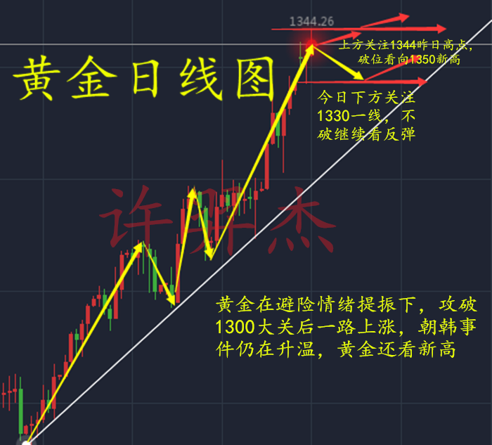 许羿杰:9.5黄金回调不要慌,晚间黄金依旧看涨 很多人看到黄金走了一波回调,目前稳于1330一线下方,有的开始心慌,担心黄金继续暴跌,有的开始迷茫,黄金接下来走势如何,羿杰觉得以目前的形势,朝韩局势这么严峻,黄金大趋势肯定还是多头。作为对冲政治和金融震荡的避险工具,战争风险协助金价走势,黄金也因美元走软而获