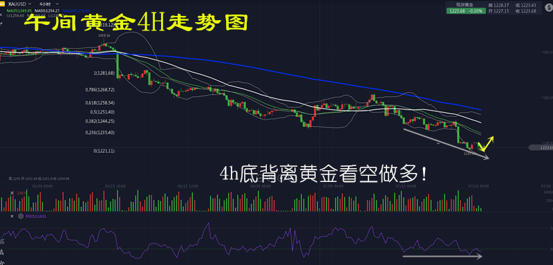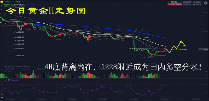 代玖阳:7.19鲍威尔重申加息,黄金乘机企稳,原油超跌! 周三,鲍威尔讲话重申前日立场,美元冲高回落险守95关口,黄金趁机企稳;油价无视隔夜EIA库存大增,这一大利好令其逆势大涨! 1今日黄金行情走势分析: 昨天反复提到黄金4HRSI已产生底背离,有反弹需求。从目前的黄金4H走势来看,底背离尚未修复,同时美指4HRSI同步共振顶背离,所以白盘主节奏回调做多看反弹! 1.1今日黄金操作策略: 亚欧盘若能回调,回调1224附近做多 止损1220.3 目标1229-33! 亚欧盘若强势突破站稳1229做多 止损3美金 目标1233-37-41! 日内首次触及1238-40做空 止损3美金 目标12