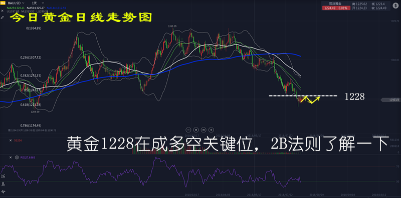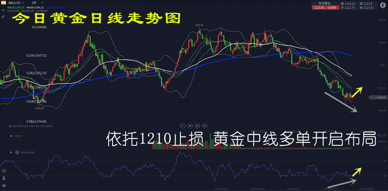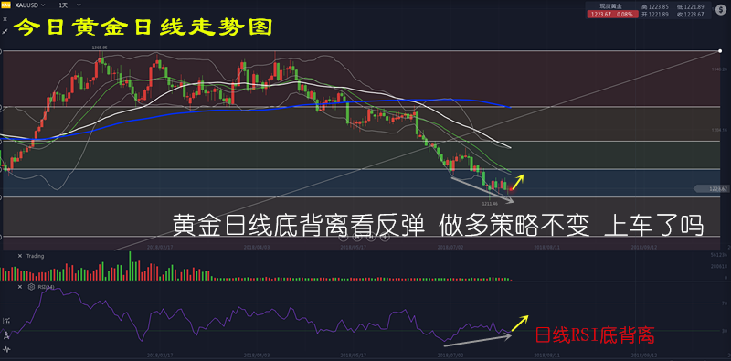 代玖阳:7.30决议周三场大戏上演,非农黄金原油或绝地反击! 本周,日银、美联储及英银三场大戏轮番上演,汇市料高潮迭起;美国6月核心PCE或掀翻市场,黄金还将面临一场硬战;重磅非农数据带刀归来,届时金价或将惊艳市场? 1今日黄金行情走势分析: 上周五结合黄金日线和美指4H,我们给出1218做多依托1215止损和1215做多1210止损的交易策略,分别布局中线多单,如果有进场的朋友,目前小有盈利,持有注意控制好仓位! 那么现在日线是否有所变化,答案是没有!依然处在RSI底背离的情况,大反弹尚未开启,没进场的朋友仍有机会上车。 1.1今日黄金操作策略: 突破多:亚欧盘站稳1224做多或是加仓 止