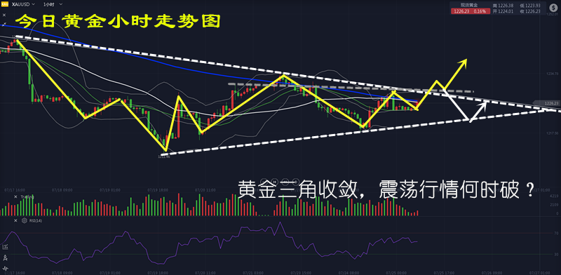 代玖阳:7.25黄金再现三角整理何时破?原油日线酝酿大行情 昨天周二,美欧谈判前夕特朗普大赞关税“最伟大”;美伊紧张局势加剧,供应缺口恐进一步扩大,API原油库存如期大降; 美元转跌显弱态,IMF指出美元估值过高,那么今日黄金多头能否绝地反击? 1今日黄金行情走势分析: 目前无论是黄金4H还是H线基本全部陷入三角整理形态,行情方向亟待突破。恰逢今天周三,我们知道周三周四是一个星期最容易出线大资金进场的时段,也是黄金交易最为活跃的时段。 1.1今日黄金操作策略: 反弹空:激进在黄金反弹1232.3做空 止损前高1235 若力度较强可选择稳健于1237.9做空 止损42 目标均是5-8美金 仓位