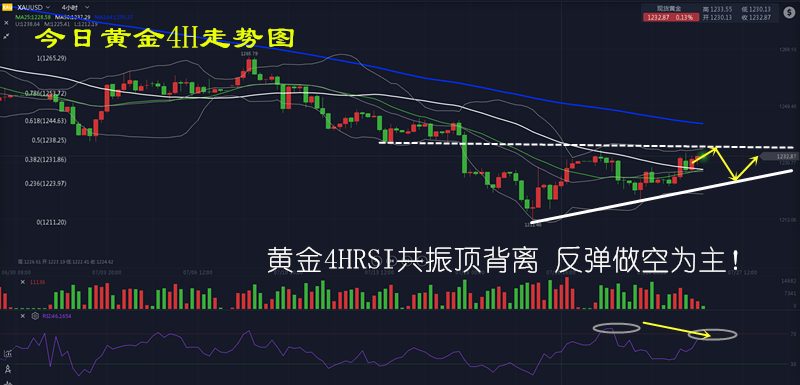 代玖阳:7.26黄金反弹仍需空,原油日线大反弹上车吗? 昨日,美元落败,黄金、非美货币趁势反攻,今日这两大数据能否为美元雪耻?美墨谈判今日开启,北美自由贸易协定仍命运未卜。今夜,超级央行风暴将如何搅动汇市影响黄金? 1今日黄金行情走势分析: 就目前黄金4h走势来讲,来到前高1235附近4HRSI将近顶背离,同时美指4H来到94.1附近也在做底背离,所以美指黄金4H同步共振的情况下,今日黄金主思路——反弹继续空! 1.1今日黄金操作策略: 操作依据——黄金4HRSI顶背离和黄金分割抓点位进场 亚欧盘反弹不过前高1235次高做空 1238加空 止损1240上方 目标1228-24-20!仓位0.