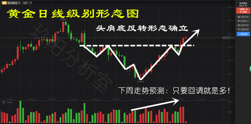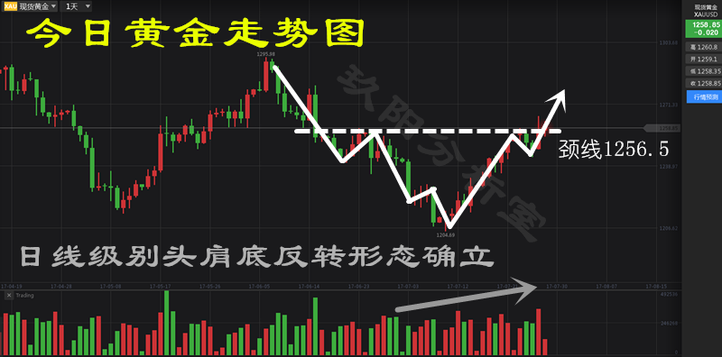 代玖阳:7.28黄金走势日线级别头肩底反转 1256就是多! 又到了周五,一周将要结束,那么我们还是要对本周前面的行情做个简单的梳理,而且7月即将过去,最后2个交易日。 国际现货黄金周四(7月27日)企稳微跌,美盘中最低下探至1254.43美元/盎司,短线惊现跳水,金价再度退守1260一线之下,周三美联储FOMC发布决定维持利