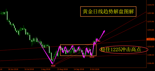 或许,不是每一次的涨跌你都能把握,可总有一波属于你的浪潮。博弈的世界没有绝对,相对的市场却充满侥幸。多数人都得经历的三个阶段:从刚入市的不怕,到一段时间的怕,再到经过时间积累之后的不怕。对于趋势而言,跟上心情愉悦、错过低头丧气,行情过后才恍然大悟,可必定这不是撰写史记。鱼用生命博得渔夫一笑,你拿什么给未来一乐?心不静了,一切都显的浮躁,心安了,所有都是能量。与其说是在分析涨与跌,不如说是抒写对与错,每一根K线上都有人性的表达,每一个起伏都点缀了多空的博弈。 黄金周一行情白盘显得格外的生猛,价格开盘上涨,而欧盘出现加速拉升,价格最高出现1233一线高点位置,价格打破1226一线上周高点位置,高