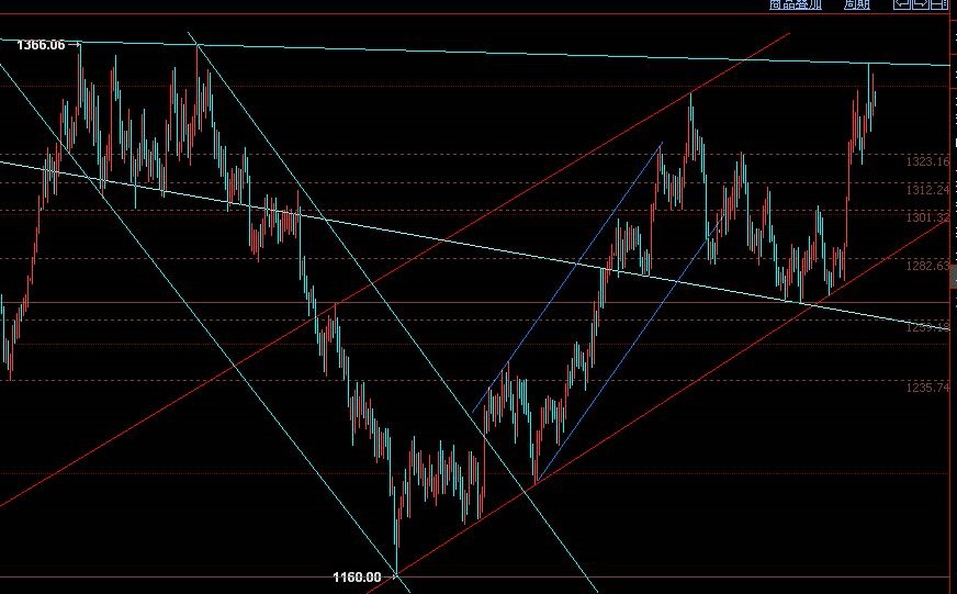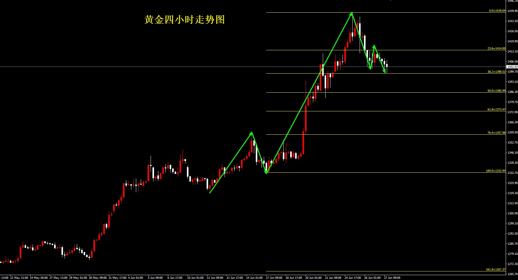 周四晚上美国众多数据公布,美国第一季度GDP数据较前值没有变化为3.1%,但消费者支出增幅有所下调。经济增长虽有加速,但出口和库存提振掩盖了国内需求疲弱的事实。在数据公布之后黄金短线下挫跌破1400关口,随后收复失地重新回到1400上方,价格波动并不是很大。 数据方面并没有表现出太大的偏差,市场在方向上的选择仍处于矛盾面。技术上我们讲到过黄金从1266位置启动以来的上升趋势中存在的结构模式。目前需要注意的一点就是价格已经达到了1333-1439上升段落比例位38.2%的位置即1398价位。周四此位表现出了强支撑作用,价格虽然跌破1400,但是触及1398立即反弹。这里我们不由的要考虑到,如果