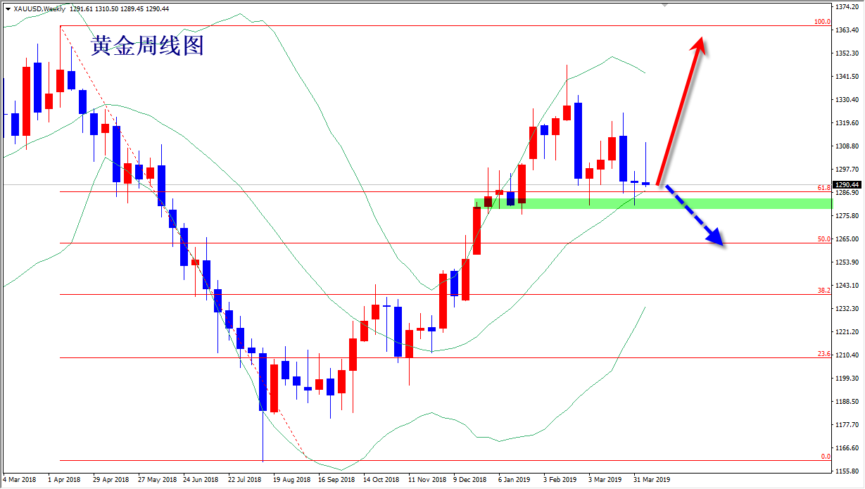 据报道称,为报复美国政府向波音提供非法补贴,欧盟正考虑对价值215亿美元产品征收关税。此前,美国政府8日曾提议,将对价值110亿美元的欧盟产品征收关税,以回应非法补贴空客飞机。本周尽管市场缺乏重大的经济数据出炉,但是澳洲联储将公布4月货币政策会议纪要,美联储公布经济褐皮书,以及美联储多位官员不同时间将发表讲话,这些都需投资者重点关注。美联储近期给出的信号仍然是不急于加息,而欧洲央行也维持利率不变。这将使得债券收益率走低,黄金会变得更有吸引力。 金价近几周都走得比较纠结,整体属于震荡偏弱格局,不过由于左方是强劲的上涨趋势,因此对于周线而言目前依旧属于回调现象,现阶段短期均线组出现拐头,但下方仍