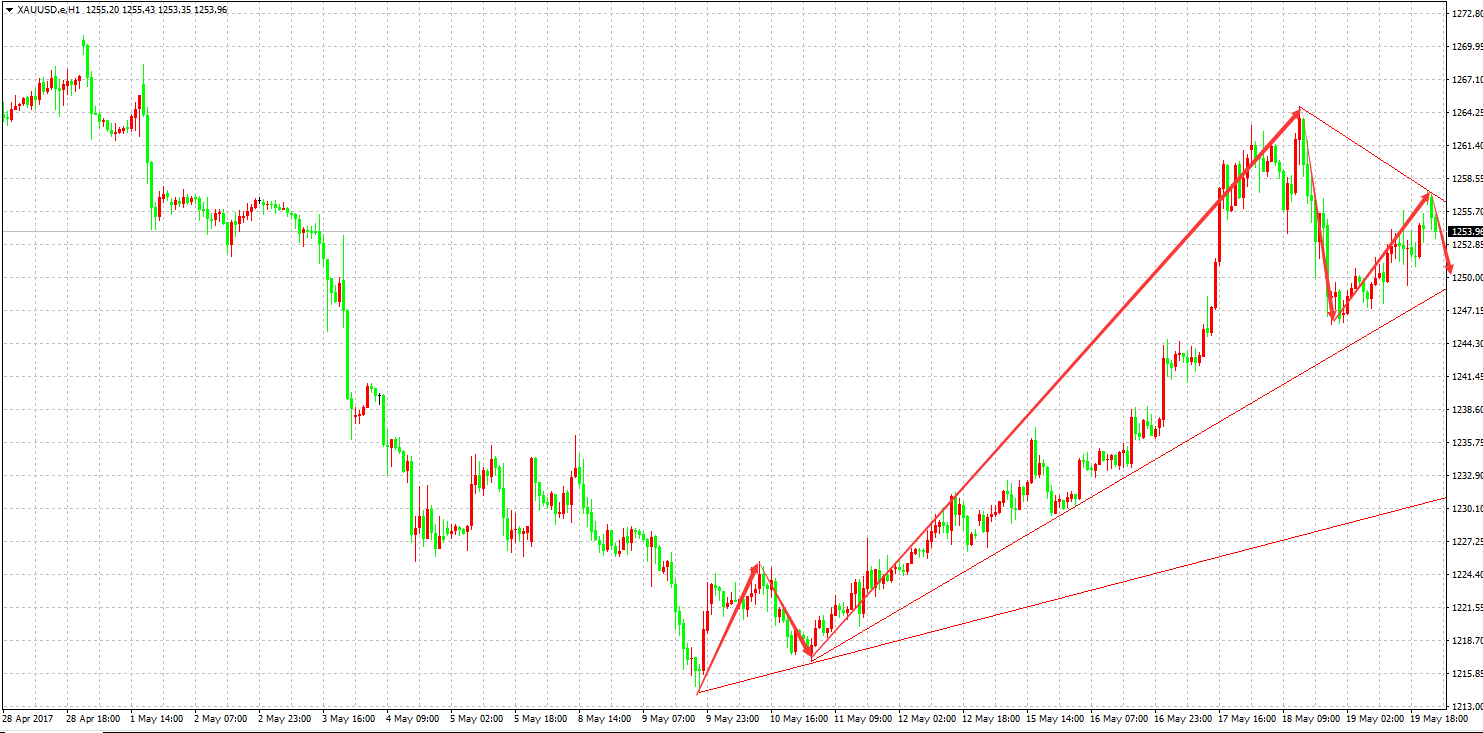 黄金在上周四从1265开始回落,周五尽管有反弹,但行情是比较弱的,因为周线收好,所以不排除这周还要突破1265的可能,上周遇阻1265回落,不过小时线这两周上升趋势并没有被破坏,周五反弹软弱无力,本周如果继续延续,那么操作上我还是会更多的考虑空单。 5月22日 黄金做单思路: 1257进场做空,止损1262,目标看1250,破位