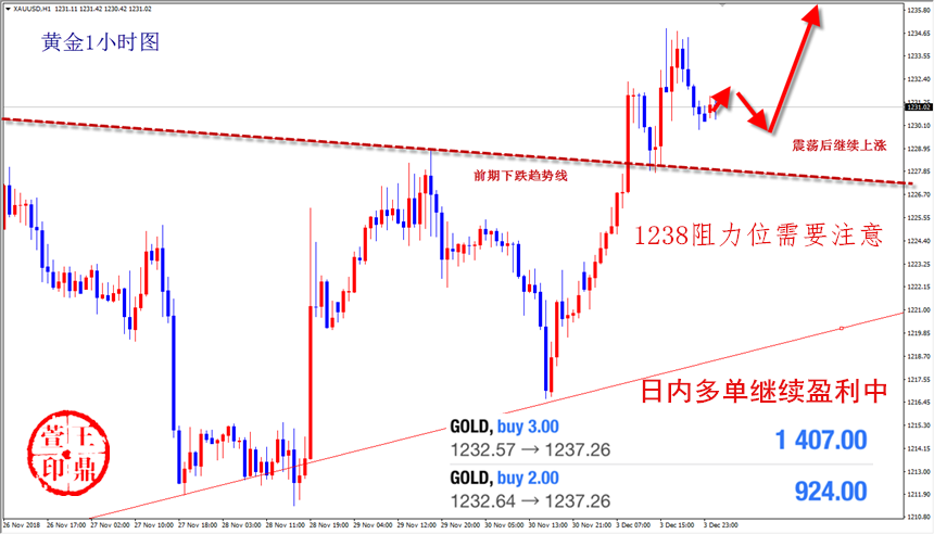 王鼎萱:12.4黄金多头依旧占主流,阻力1238需要注意! 拖延才是最彻底的拒绝,看似还留有一丝期望,其实说白了,不仅不认真,还懒得解释为什么要认真。十年年多一路的坚持,或许为此失去了不少,选择了孤独就不需要给人解释为何寂寞,坚持不就因为来自骨子里的热爱。不需要要求每个人都变成另一个自已,想着放弃多容易,比日复一日的努力容易多了,不是所有人都想创造一个破釜沉舟的故事,投资同样是一个自我造梦和圆梦的过程。 ——黄金多单两连胜,大好行情静等收网:—— 昨日黄金受到毛衣战缓和及美联储未来可能暂停加息的双重影响,一路上涨,鼎萱也分别在早盘1222位置,欧盘1227位置提示多单进场,最终黄金上涨至12