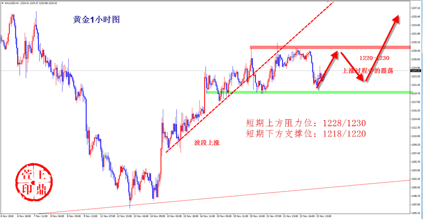 王鼎萱:11.22黄金走势分析,区间震荡,多空如何获利? 很多时候投资朋友们去熬夜,不是因为赚到钱了,恰恰相反,大多数时候是因为亏钱、套单,辗转难眠。外汇市场真的赚不到钱吗?诚然不是,这个遍地是黄金、漫天飞钞票的地方随时都是机会,只不过你缺少的是一个方向,一个好的方法和那一点点运气,漫无目的做单就像玻璃上的蚊子,前途一片光明,却找不到出路。同样,很多人在这个市场过于焦躁,有赚一个亿的野心却没有坚持三天的耐心,这都是阻碍你走向成功的绊脚石,只会把你拖向深渊。我很认同一句话,当你的才华不够撑起你的野心的时候你应该静下心来学习。 ——黄金震荡过程,切勿追涨杀跌:—— 行情最高上冲到1230