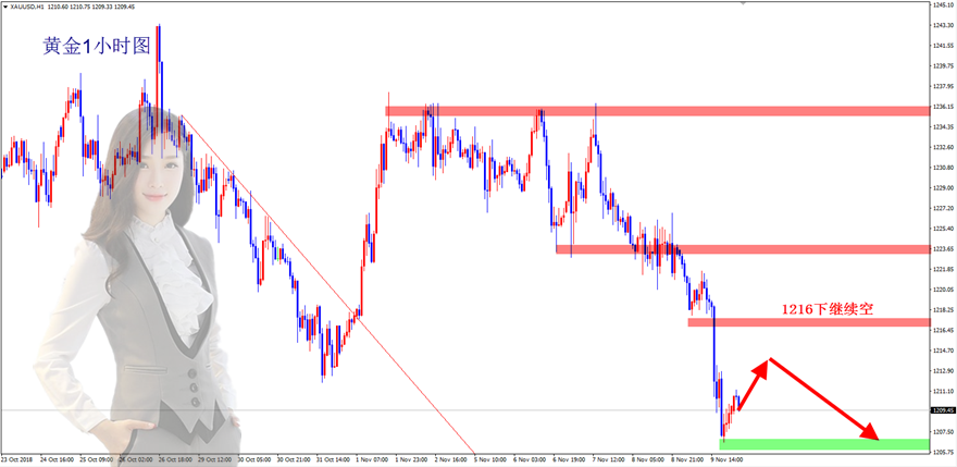 王鼎萱:11.12黄金还得继续空,多单被套有何良方? 过去的一周对于黄金空头来说是胜利的,而且是完胜;上周黄金开盘1233.1盎司/美元后,连续三个交易日维持1223-1235区域整理,高位连续冲击1235/1236压力位均遭遇承压之后回落,周四开始黄金弱势走势继续加速,周五黄金自1222承压整理向下且在晚间美盘时段击穿1218之后快速向下跌破上周1211.7的低位后于美盘后半段刷新1206.3盎司/美元的新低,而后反弹至1209.7盎司/美元收盘,单日收取实体大阴线,周内连续五个交易日全部收阴之后形成日线六连阴,周线更是以实体大阴线收盘; 在杠杆交易中,方向很重要,点位也一样;趋势中方向大