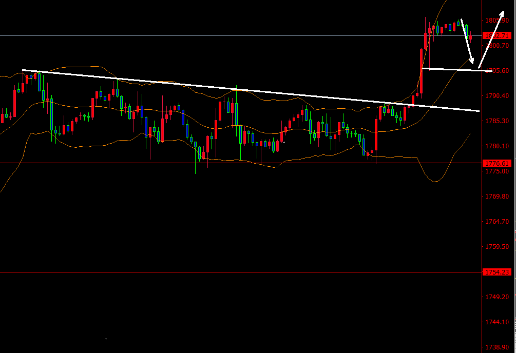 策测解金:黄金受中东局势紧张拉升做回补缺口,原油遇阻依然高空 金银油基本面分析: 昨日黄金符合预期先跌后涨,白天震荡下行,晚间重返1790,,受美联储鹰派官员讲话影响,黄金一度跌破1780,但在阿富汗局势升温,市场恐慌增加避险情绪被触发,黄金反弹走高,突破1793压力,收复日内失地之后持续走高,高点触及1798。最终黄金收涨0.09%于1791.7,录得一根阳十字星,对今日金价比较有利。 原油方面,昨日还是稳于67.0之上,剧震运行于67.0-68.3,受阿富汗局势的影响,原油过山车的走势,昨日录得一根阴十字星,上方没有破高,整体涨势被止住,日线指标进入超买区,4小时受压于68.5,小时图中