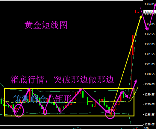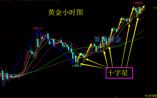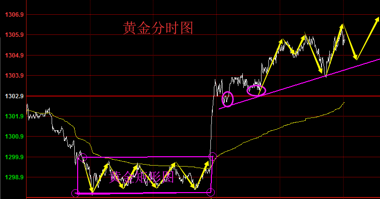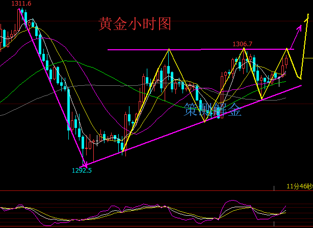 策测解金:3.14黄金多头尽善尽美,强势回归继续破高 黄金技术面分析: 黄金周二延续上涨收高,低开高走收盘在1300上方,最高到达1302,和上周日说到的1310目标也临近,由于美元短线回落,提振金价进一步突破千三关口压制,同时日线收盘中阳线。周三早间就给出了继续看多的诠释,1302多单策略,盈利6美金,操作一手盈利600美金,目前从日线上看,双阳夹阴线的反弹延续。那么周一的阴线就是一个回踩修正的K线,突破后K线形态走成中继反弹,周一中阴回踩,周二转阳二次拉升,收“两根阳线夹一根阴线”的走势,此走势为“多方炮”的看涨形态,日内如期上探,均线勾头向上,短线承压20日均线1311之下,若此位上破