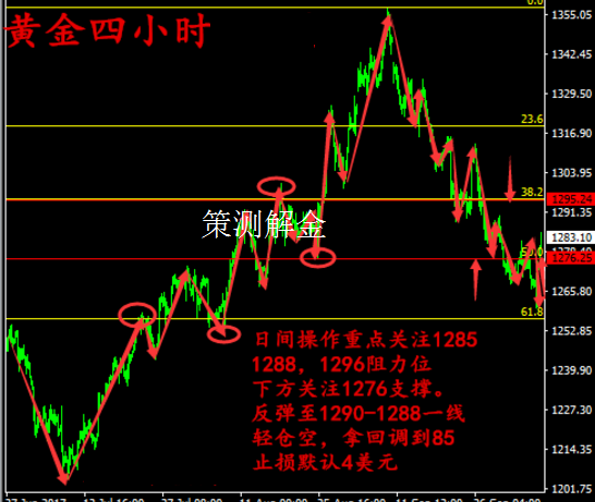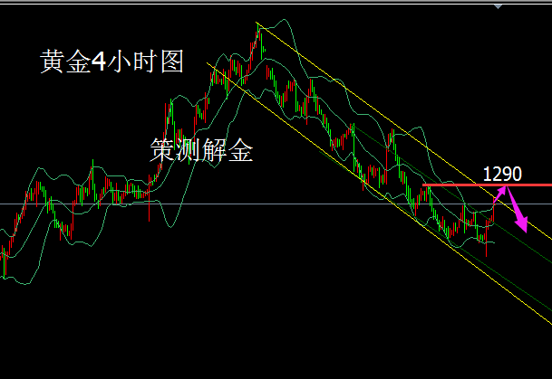 策测解金:10.9黄金原油技术分析附策略 黄金技术面分析: 从上周的黄金走势来看,一个大十字阴告别上周,目前从日线分析,MA5拐头朝上,受下方1276的支撑,布林带开口扩张,金价运行于布林带中下轨之间,短期有反弹趋势。附图MACD指标快慢双线于0轴上方死叉下行,绿色动能柱缩量,说明下方的支撑不破位将上行。四小时K线图来