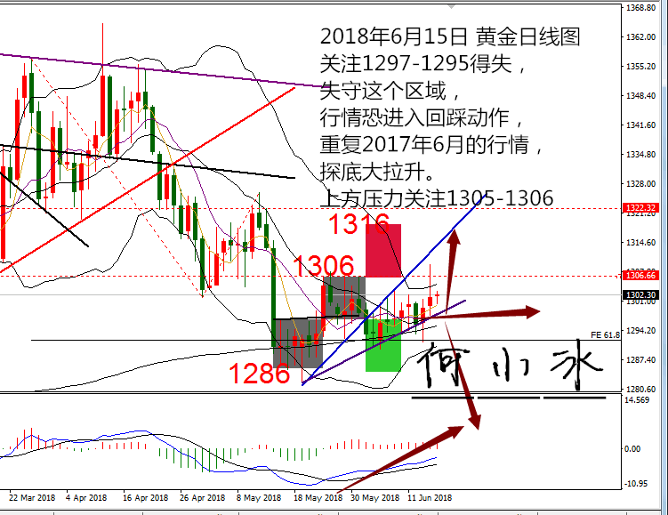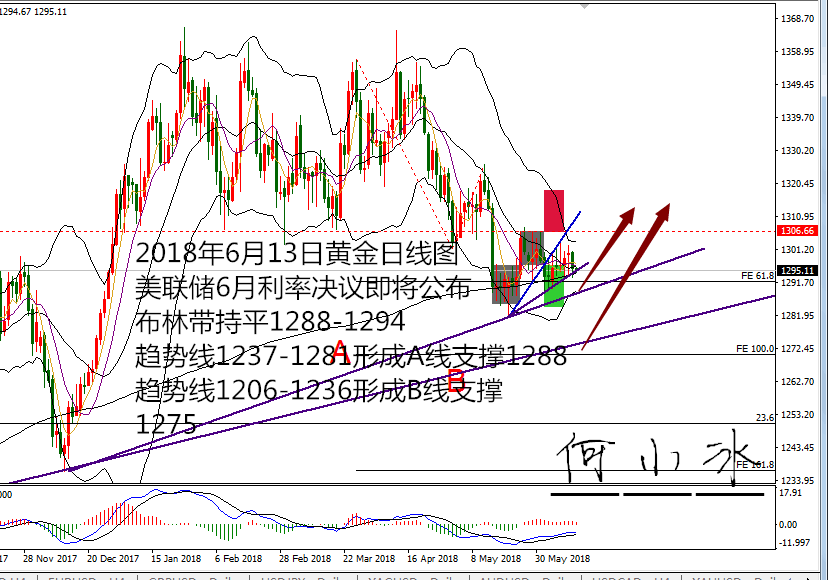 何小冰 美联储加息登场,黄金历史重演单边 06.13 6月12日隔夜特金会成功落幕,市场反应不大,美国CPI表现强劲,创6年以来最大增幅,鲍威尔提议每次利率决议后增加新闻发布会,美元回补跳空窗口后直线拉升。欧盟将从7月1日开始对美实行贸易制裁,欧元区经济数据再显不佳,欧元受到拖累震荡走低。梅姨赢得下议院脱欧支持,英镑盘中两度冲刺1.340上方,尾盘受到美元走强,打压回落。 6月13日期待已久的超级数据即将拉开序幕,今晚凌晨2点美联储利率决议打响第一炮,加息毋庸置疑,预计加息25个几点,下半年加息规划以及鲍威尔的措辞才是重点。欧元区经济数据近期表现不佳,拖累欧元,英国强劲的经济数据,以及脱欧投