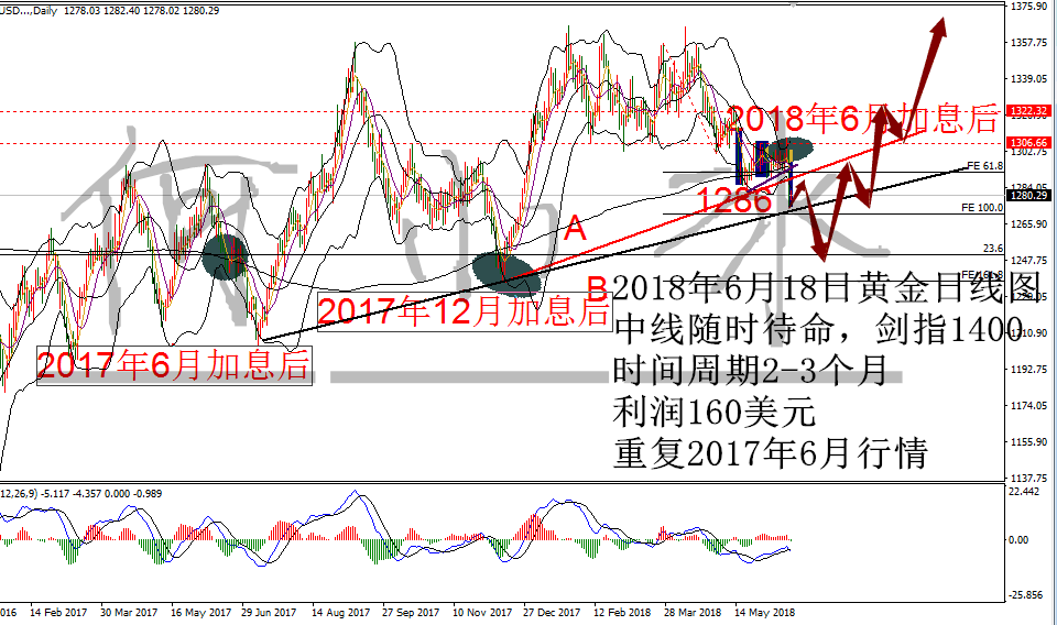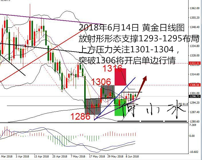 何小冰:加息落地,黄金欧元英镑低多冲刺 06.14 6月14日美联储加息的钟声敲响,完成第七次加息安排,目前利率至2%,预计下半年仍有两次加息的可能,不过随后美联储主席鲍威尔召开新闻发布会释放鸽派言辞,支持循序渐进加息,美国经济非常好,相信有能力加息,但是也担忧加息过快会有危险,市场解读为偏鸽派信息,黄金结束加息后的小幅反弹,快速拉升6美元冲高千三关口,美元支撑承压94.1跌至93.44。EIA原油库存数据意外利好,加上IEA月报数据表现靓丽支撑油价震荡走高,日线金叉向上。 非美货币方面,同样是出现探底回升节奏。 6月15日美联储打响超级星期四第一炮,欧洲央行接力发布利率决议,此前欧洲央行大