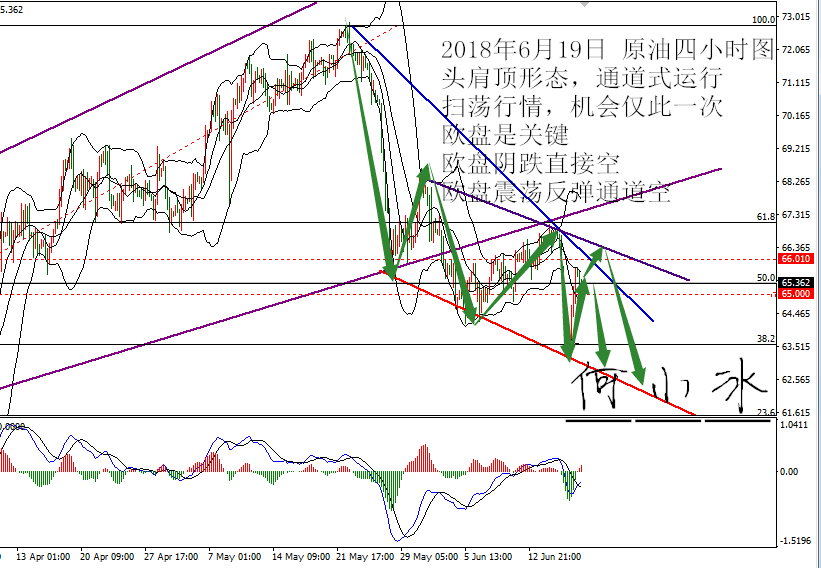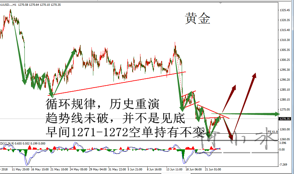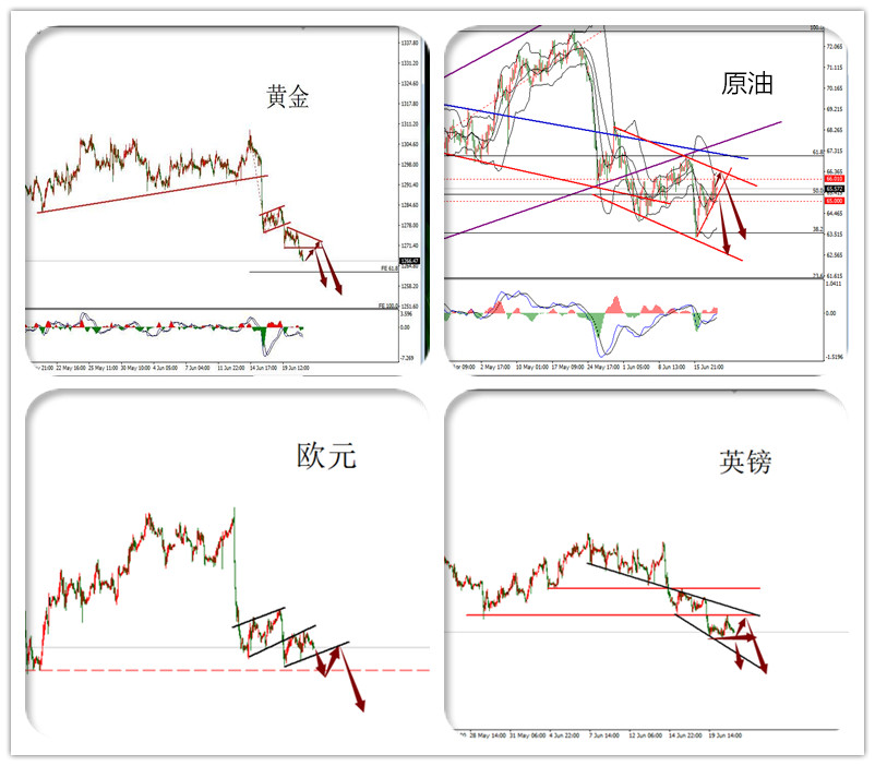 何小冰:加息+黄金分割确定中线进场区域,短线都是空 06.20 6月19日隔夜受到中美贸易战白热化以及中国股市断崖式下跌影响,黄金等避险资产白盘呈现震荡反弹,但抵不过欧盘时段德拉基的宽松措辞以及英国脱欧方案被驳回的影响,欧元英镑加速下探刷新低点位置,美元强势测试95.2关口,黄金美盘前后承压回落刷新低点1270.原油增产意见不一,油价来回扫荡。 6月20日维也纳大会前各国油长将陆续发表讲话,意见观点不一,将使得油市上下波动频率更高,晚间还将公布EIA库存数据需要留意。贸易战增加新战场到欧洲地区,欧盟今日表决反击美国钢铝关税措施。四大央行行长今天轮番上阵,外汇市场是不会平静的。 技术分析: 美