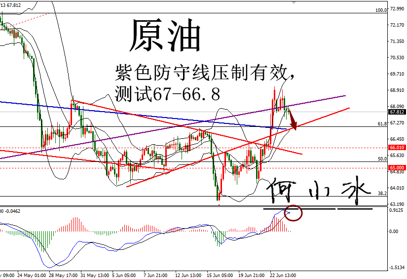何小冰 黄金震荡跟多,原油68.1空 06.26 6月25日 隔夜中美贸易摩擦升级,欧美口水大战,全球股市集体跳水,黄金不为所动,围绕低位区间横盘震荡调整,美指冲高回落刷新近期低点。欧佩克增产幅度恐扩大,油价回补跳空窗口后短线跳水。欧盟为希腊债务减负,欧元窄幅走高,英镑紧跟其后。 6月26日 美指冲高回落,滋生见顶言辞,日内谨防美国经济数据救美扫荡。加拿大油砂停产对油价有支撑作用,英国6月CBI零售销售数据来袭,能否助力英镑打开区间。 技术分析: 美元指数 周线冲高回落,收取倒锤子形态,阴阳交替,分界区间94.2-95.2,日线图连阴回落,生命线位置94.2,昨日提及四小时压制线位置94.8