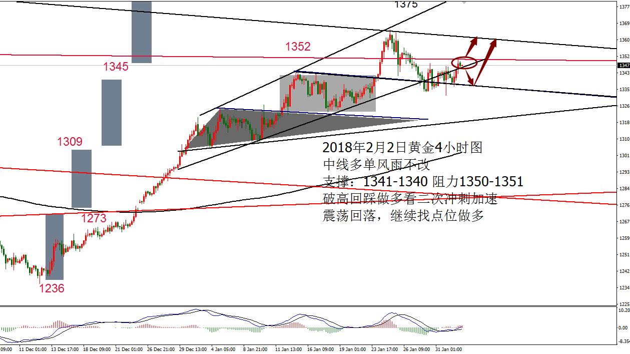 何小冰:黄金先空后多避险加速,货币对全线破防守02.06 全球股市抛售潮,黄金避险启动,周一在1330的位置再次重复1月22日-1月23日的不延续行情,加速突破分界点,黄金隔日早间探底1328后震荡反弹,美盘承压1338回落1332确定支撑,后半夜开始震荡反弹向上,凌晨加速突破1338后刷新高点,触及1345-1346 刚到触及趋势线通道压制