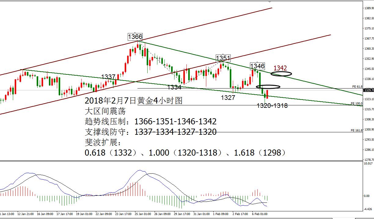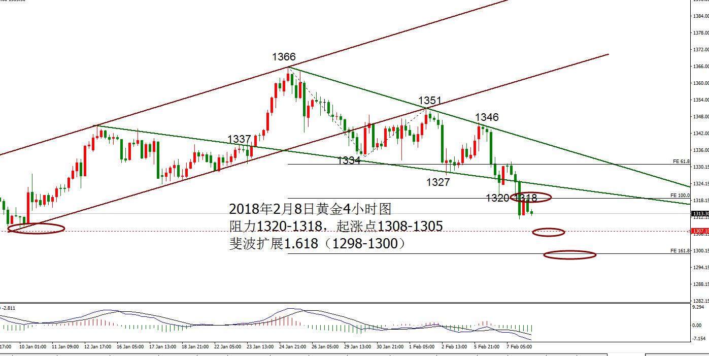 何小冰 黄金不破1320仍是空,原油终极斐波扩展02.08 黄金前两轮起涨点1324及1308接连被挑战,支撑阻力相互转换,跌破反弹变成阻力加速下探,隔夜的支撑阻力转换位置1324-1325是今天的防守点,下方的第一轮起涨点1308是目前可测的支撑位置,除此之外便是斐波扩展1.618的位置1298-1300是回调的阶段性目标。四小时年线再次出现