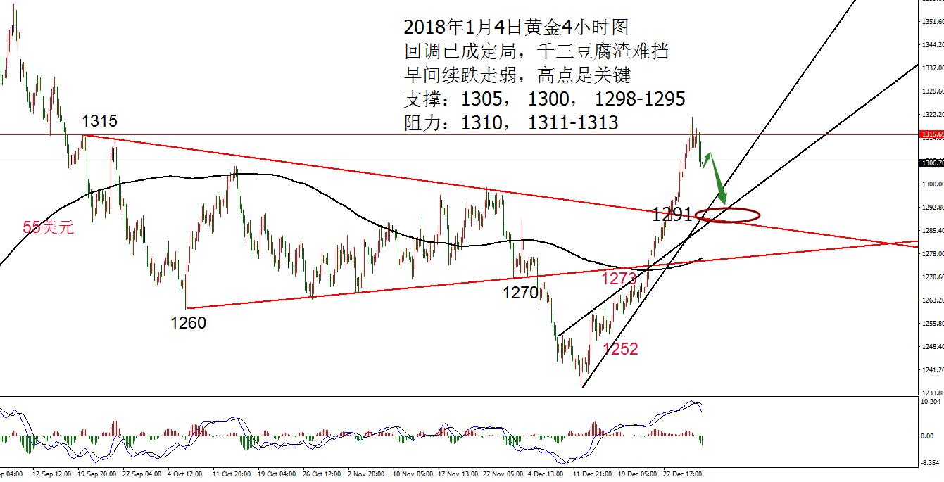 何小冰:黄金早盘急跌走延续,原油欧盘定激稳 01.04 周三黄金早盘冲高1321后快速回撤10美元到达1311附近,为近半个月来最大的回撤力度,欧盘窄幅震荡调整,已经打破慢牛规律以及慢牛循环,就不再是强势拉升行情,回调是在所难免,只是时间的问题,早间顺势跟多止损出局,欧美盘时段两进黄金空单,持仓过夜,借助美联储12月货