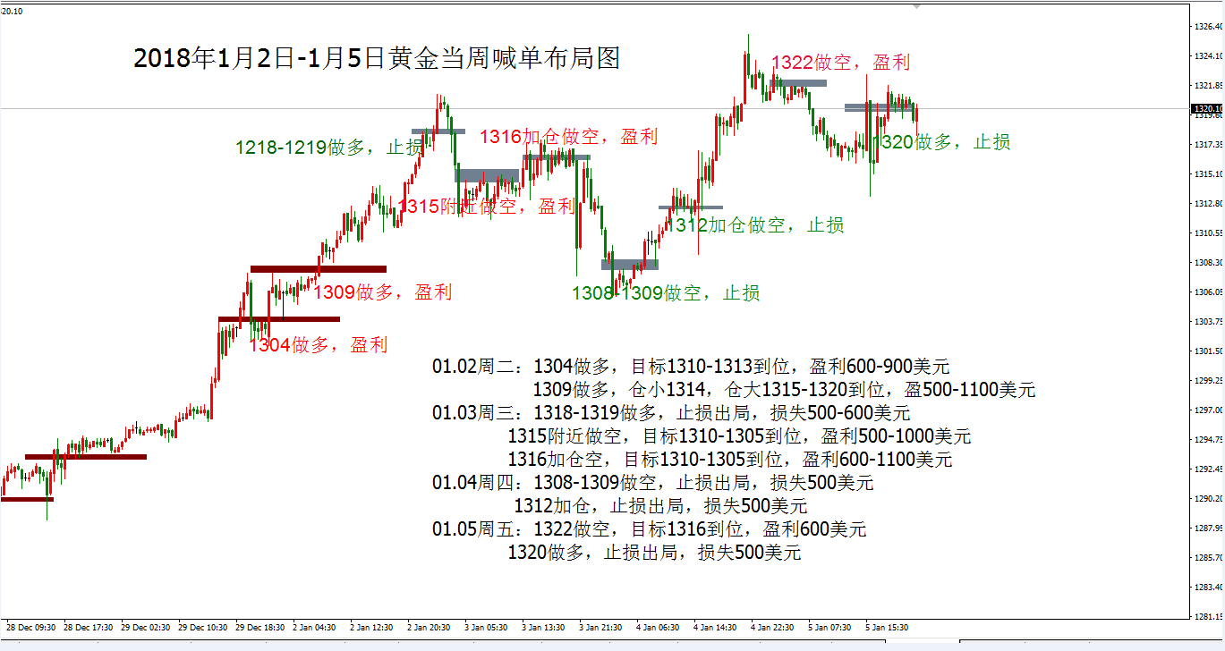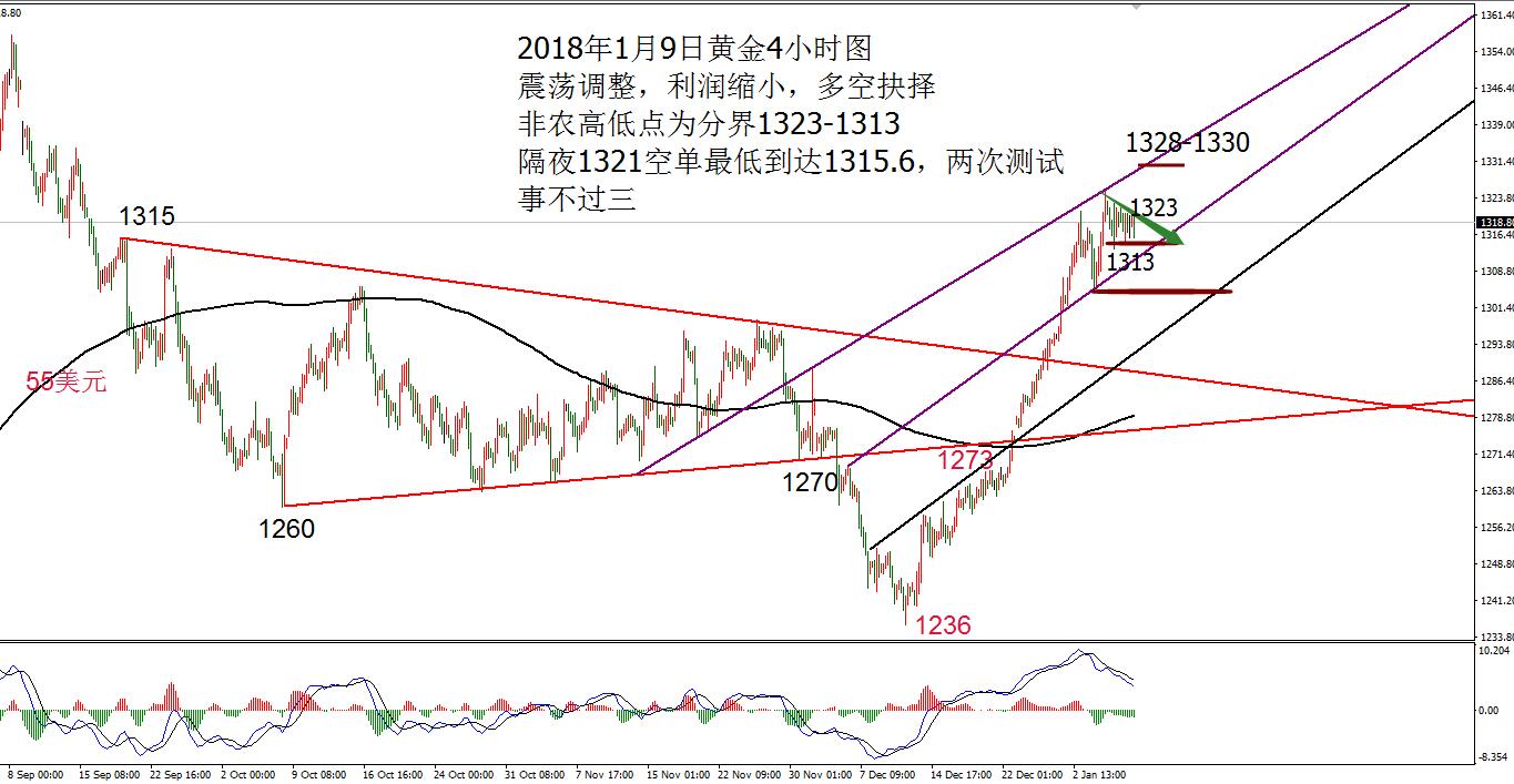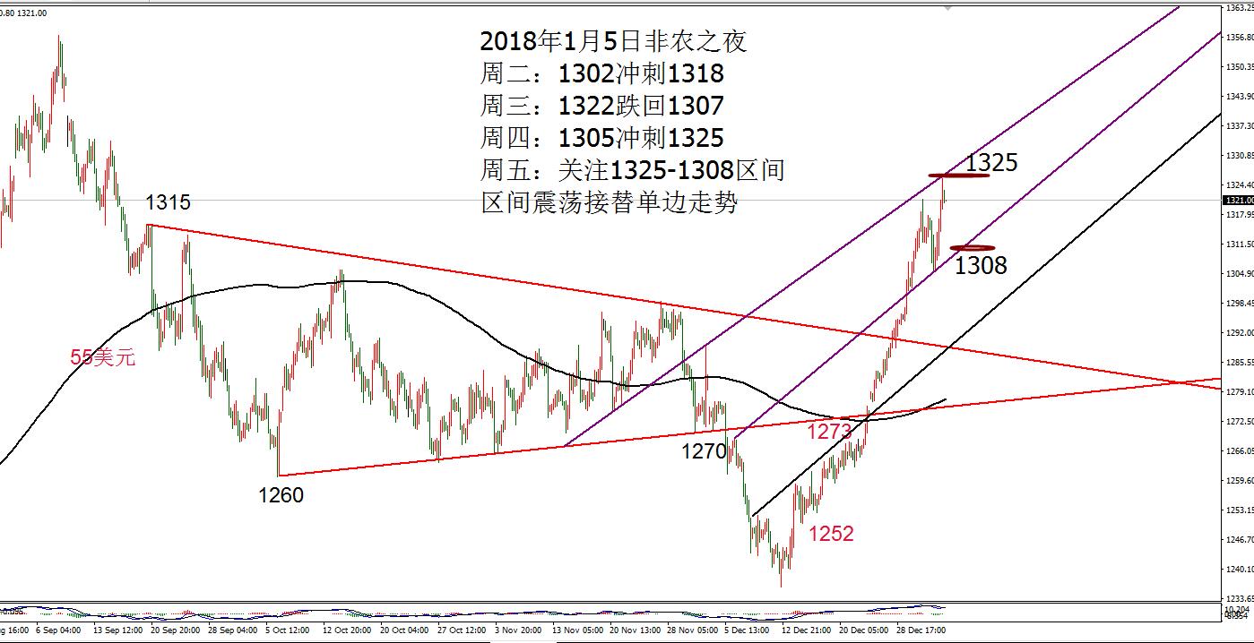 何小冰:黄金非农看震荡,原油加速十字星 01.05 2018首战非农,在上周黄金延续慢牛加速冲刺的节奏,不断参考高低点切换,刷新高点,逼空式上涨,基本没有像样的回调。本周周初仍是沿用这样子的规律加速冲刺刷新高位1321,可惜好景不长,周三白盘快速回撤10美元,欧盘震荡调整,美盘反弹承压,次日凌晨借助美联储12月货币政策