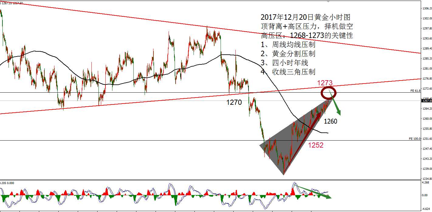 何小冰:黄金1273以下跟空,原油顶背离跟空 12.21 黄金进入周四,除了周一带来10美元的利润行情,周二周三基本都是5美元行情,掐头掐尾,利润少得可怜,食之无味,弃之可惜!自1300-1236下探后走反弹,成功站稳0.618位置1260继续走反弹,现在已经到了分界点0.5位置(1268)以及防守线0.382(1275)。多头的动能开始乏力,耐