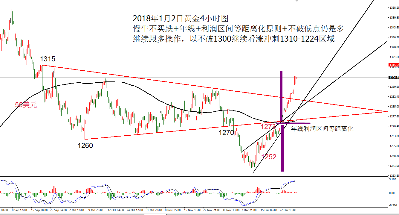 何小冰:黄金原油仍是多,美日不破113仍是空 01.02 又是跨年拉升季,连续14年黄金出现同样的行情节奏,慢牛上升。上周五明确给出操作计划单子黄金回踩跟多操作,美盘过后加速冲刺1300关口并且最终收线在此上方,继续走高位收盘结束。 2018首个交易日,早间开盘直接拉升刷新高位,今日需要关注的就是低点1302的得失,强势不深