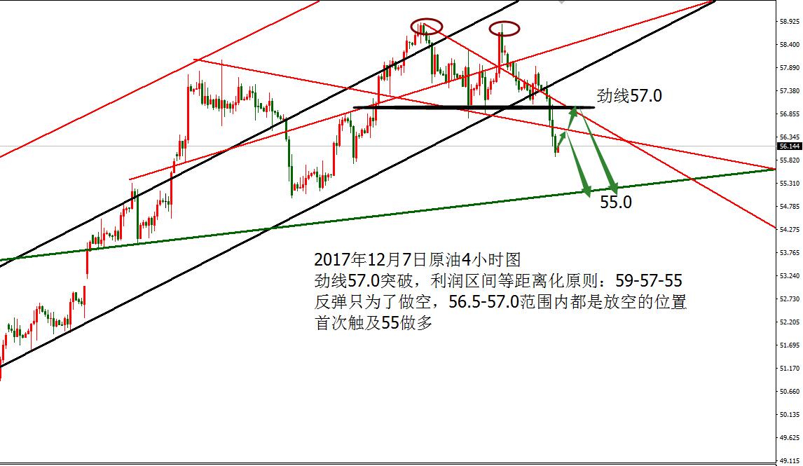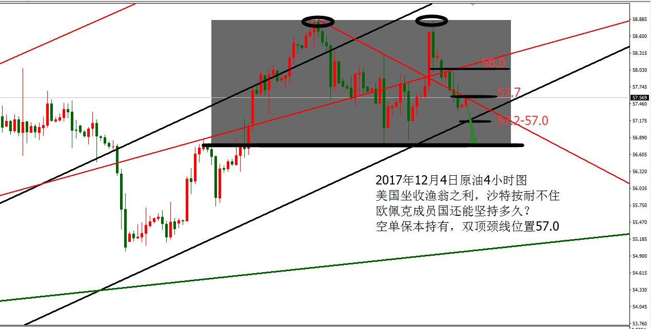 Anna点解:原油双顶颈线57,黄金只有一个思路便是空12.05 周一黄金窄幅震荡,欧盘时段市场机构砸盘空头测试1270未果,尾盘震荡收盘结束当天的行情,原油方面因为沙特暗示退出减产协议,欧佩克成员国烟雾弹不断,美国石油钻井及页岩油产量飙升,市场开始担心欧佩克成员国在利益面前还能撑住多久? 原油隔夜布局57.75及58.0的
