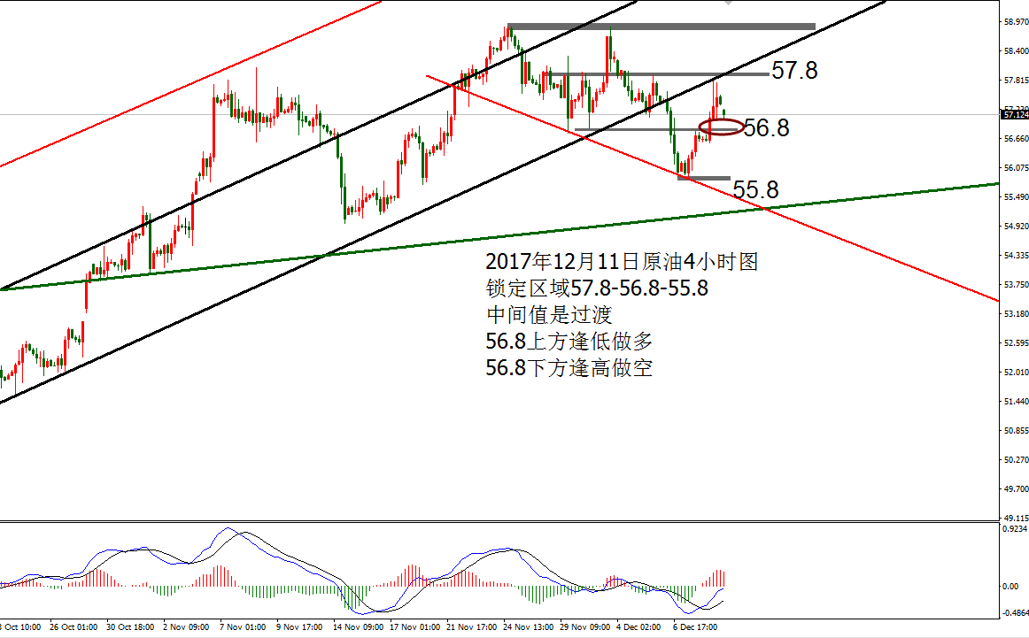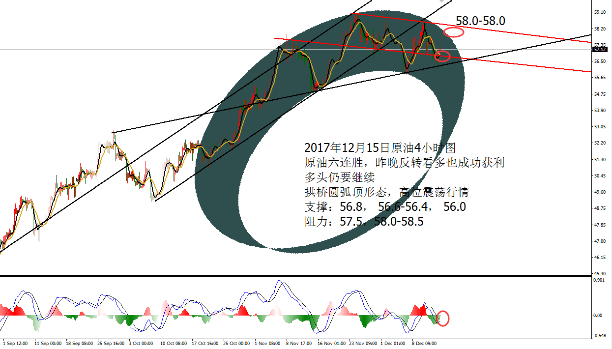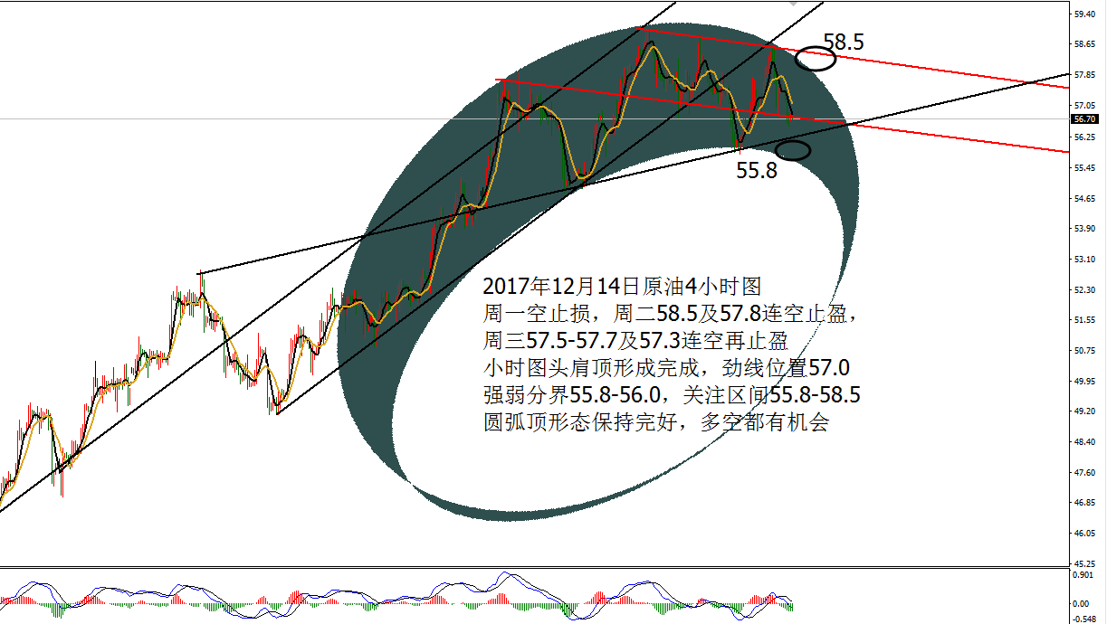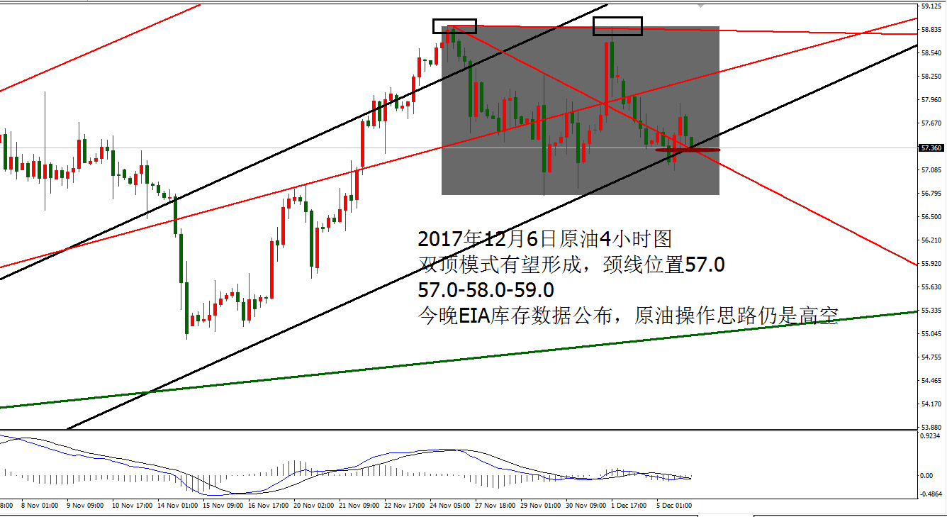 Anna点解:黄金均线分界空连胜,原油高空待EIA 12.06 周二机构接连砸卖盘,黄金承压1277节节败退,跌破9月份至今的大三角支撑位置1270,探至1260-1261,尾盘收线趋势线下方。原油继续围绕震荡,触及颈线支撑57.0获得支撑反弹,承压58.0,早间公布API原油库存数据大幅减少548.1万桶,反弹的油价反而没有加速,走震荡回落,目
