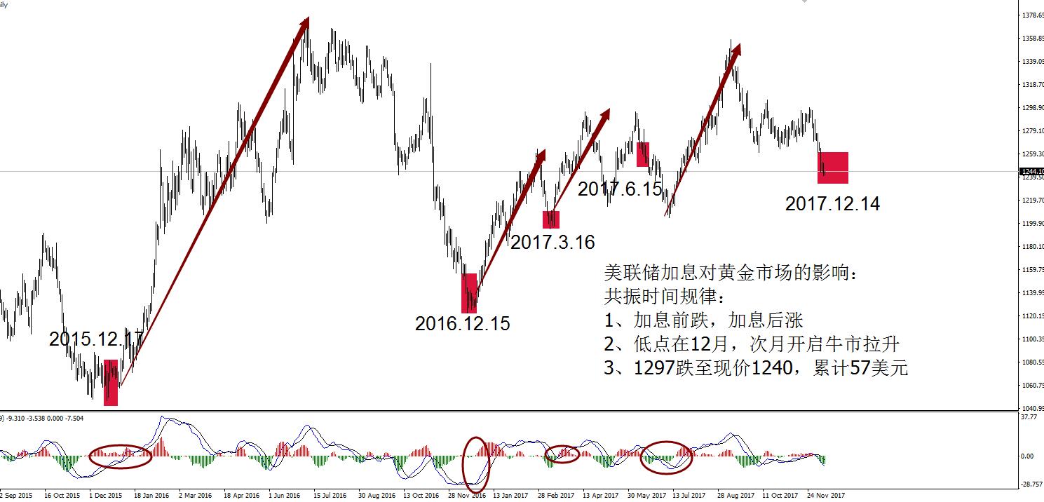 何小冰:黄金1240定多空,跨年中长线 12.12 黄金周一承压非农高点1252回落,午夜过后加速下破1246,刷新低点1241,早间开盘直接破低反弹。美联储议息决议之前,黄金空头压力仍在,,不妨在做一下每次美联储加息前后对于市场的影响情况。 回首美联储加息对于市场的影响: 1、2015年12月17日美联储宣传首次加息,黄金从10月11