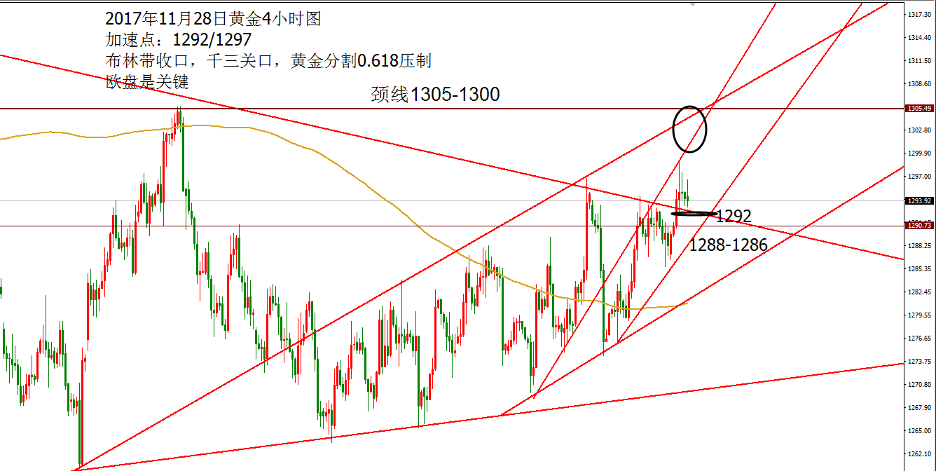 Anna点解:黄金一波三折守1297看跌,原油欧盘定多空 11.28 月末尾班车第一天就已经很激烈,通俄门再掀风波,日本透露朝鲜或准备发射导弹的电波信号,刺激黄金冲刺1300关口,最高触及1299后走回落急挫至1292。特朗普税改法案传来好消息,鲍威尔凌晨通过美联储官网发布,预计美联储会保持循序渐进的加息模式,并坚决回应金融和