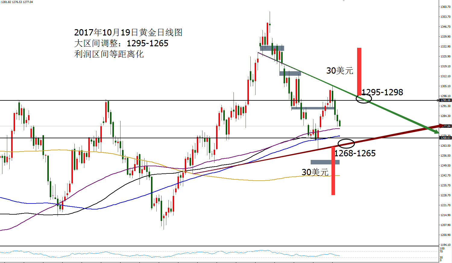 Anna点解:黄金1282定强弱,原油欧盘定趋势 10.19 周三黄金延续下跌,亚盘反弹确定阻力,欧盘破低1281,美盘加速下探新低1276,尾盘小幅反弹震荡。 亚盘反弹确定阻力,欧盘回落破低,美盘还有一跌。 黄金日线三连阴,均线MA5及MA1靠拢形成死叉,大区间震荡已经完成1295-1265,收敛三角,利润区间等距离化,破位上下迎来30美