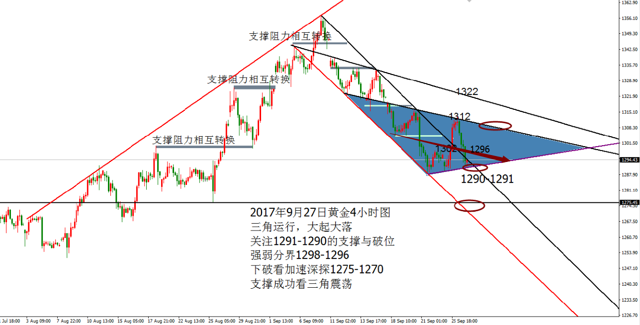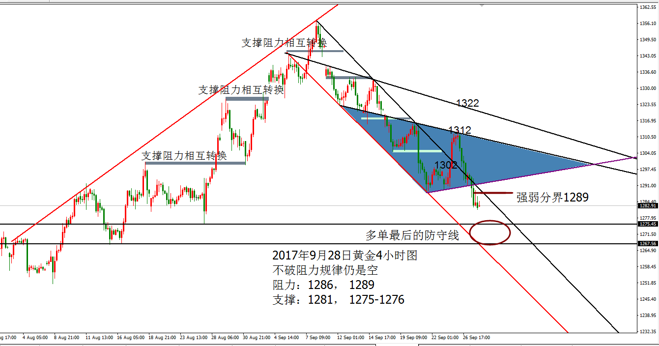 Anna点解:黄金强弱分界1289,原油强势震荡 09.28 周三黄金亚盘反弹测试凌晨最后的阻力位置1296承压回落,午后二次确定阻力1296,欧盘开启承压回落,跌破日内低点1290.5,反弹确定阻力加速下跌至1286一线,美盘诱多二次加速下探1282,最终收于1290下方低位震荡。 前一日弱势,亚盘反弹不破凌晨阻力位,欧盘破低,美盘还有一