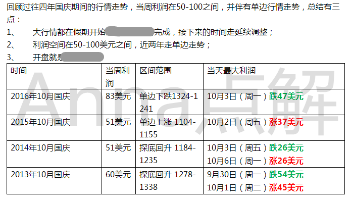 Anna点解:2017年10月国庆行情前瞻预告 每逢佳节必有事,2016年国庆期间美国释放鹰派信息,强调年底加息,12月加息概率飙升70.2%,机构大手笔砸空单,黄金一泻千里,过节前在1324上方,过节后都去1241,连续7天下跌近83美元,即使当周公布美国9月非农新增就业仅15.6万人也未能改变跌势。 回顾过往四年国庆期间的行情走势,当