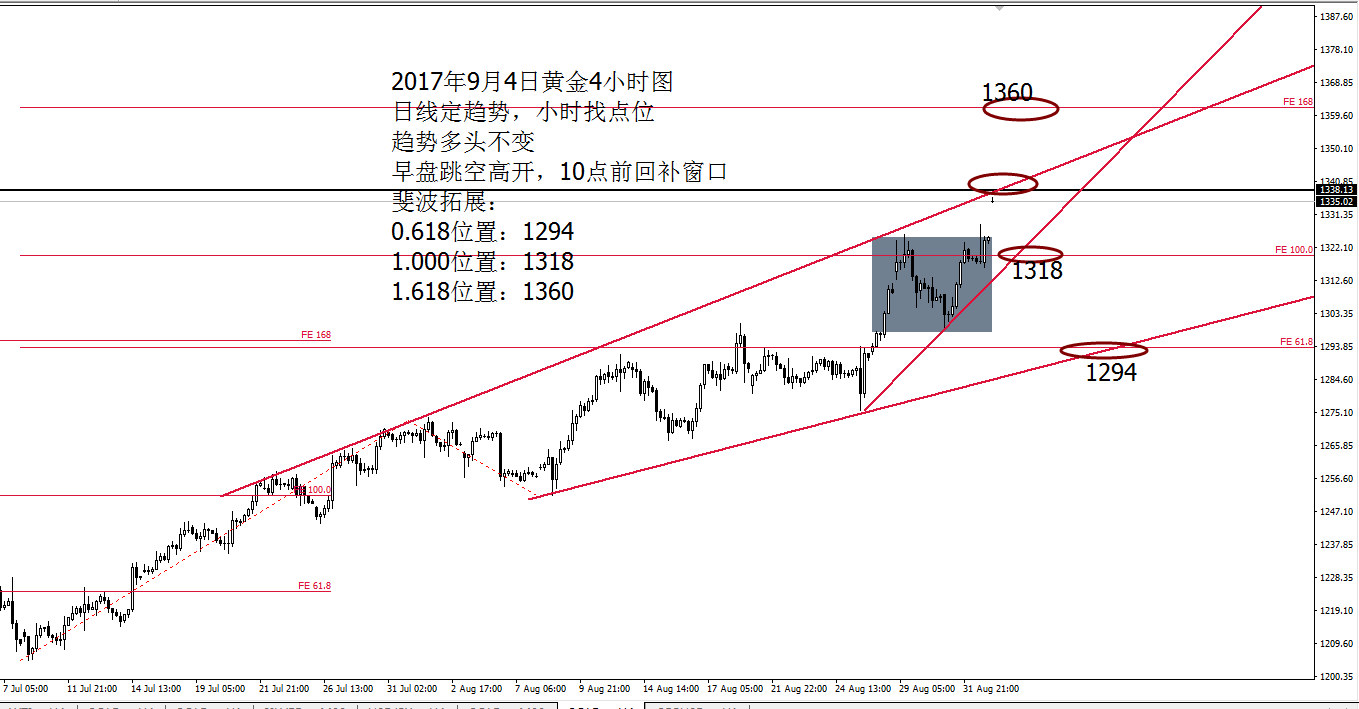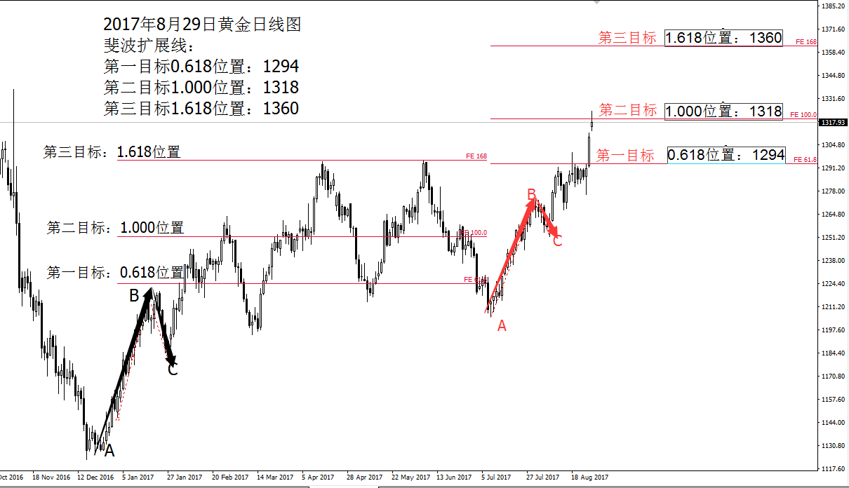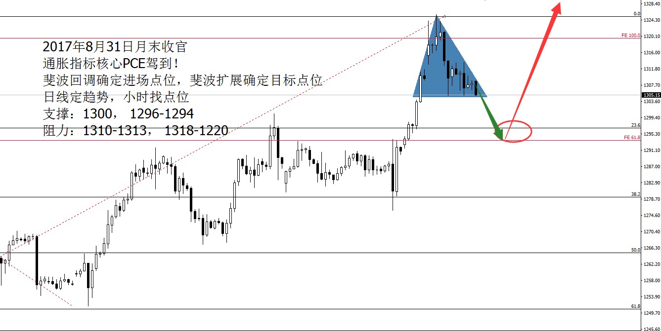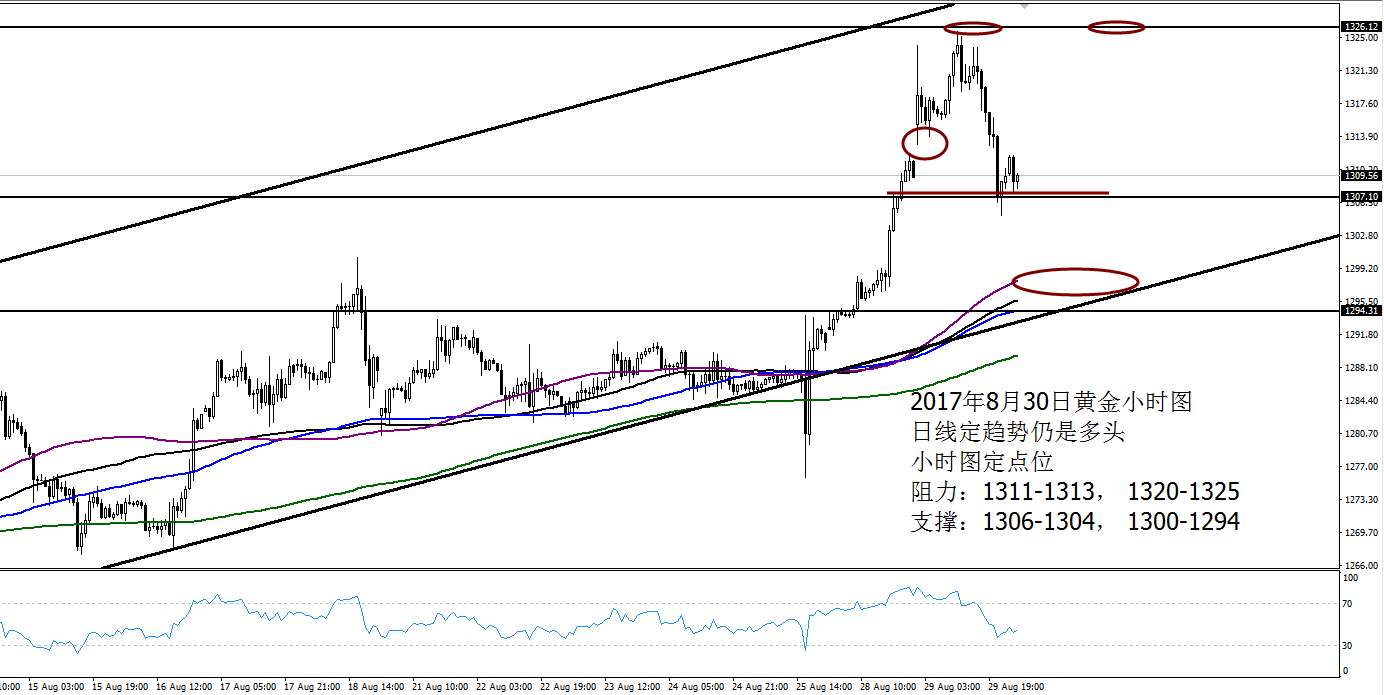 Anna点解:08.29斐波扩展黄金目标1360,原油死叉逢高做空 周一七夕,黄金带动冲刺1314的好意头,白盘时段由于人民币在岸、离岸创新高,黄金延续上周五的高位震荡冲刺,晚间时段仍是人民币创高带动黄金冲刺1308,尾盘震荡收盘1311一线,今日早间朝鲜再次挑衅美日,炮弹一响,黄金万两,黄金直接跳空高开,刷新特朗普大选之前