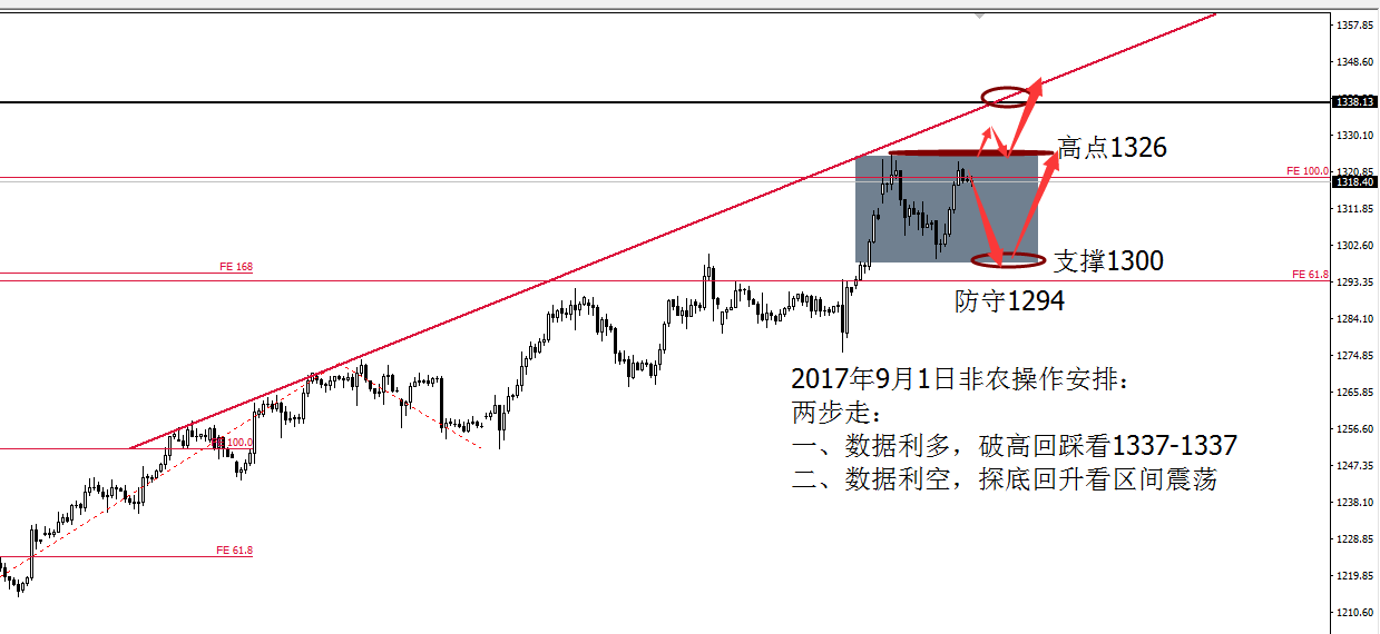 Anna点解:金九非农不破1294仍是强势,两手准备迎接非农 本周黄金周初延续上周五的探底回升,周一突破1300关口,周二借助半岛危机跳空高开高走,刷新高点1326,周三凌晨快速回撤收复跌幅,延续跌势向下,周四早盘急跌触及1300关口,探底回升重回1324。四天走了一个来回震荡,破位1300后走1300-1326,目前市场报价1320附近。