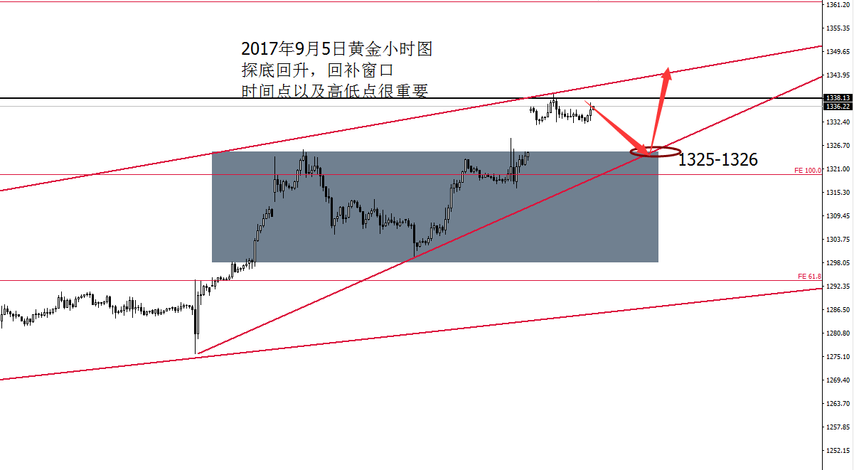 Anna点解:09.05黄金不破1339看回补窗口,油多空分界48.0 周一黄金因朝鲜避险性事件跳空高开10美元,亚盘未回补窗口,午后欧盘加速上冲刷新高点,晚间过后走震荡回落,因美国劳动节休市,美盘时段黄金1335-1332窄幅震荡调整。 黄金跳空窗口仍是未能回补,但是我们知道回补窗口是必然的,却不在乎时间,有的跳空窗口需要时间