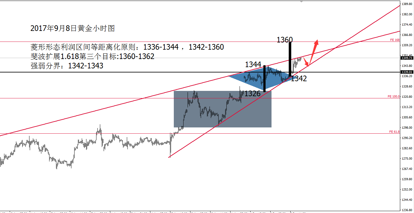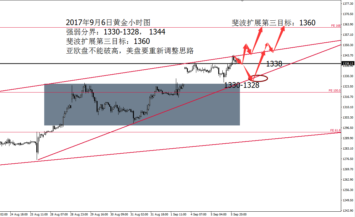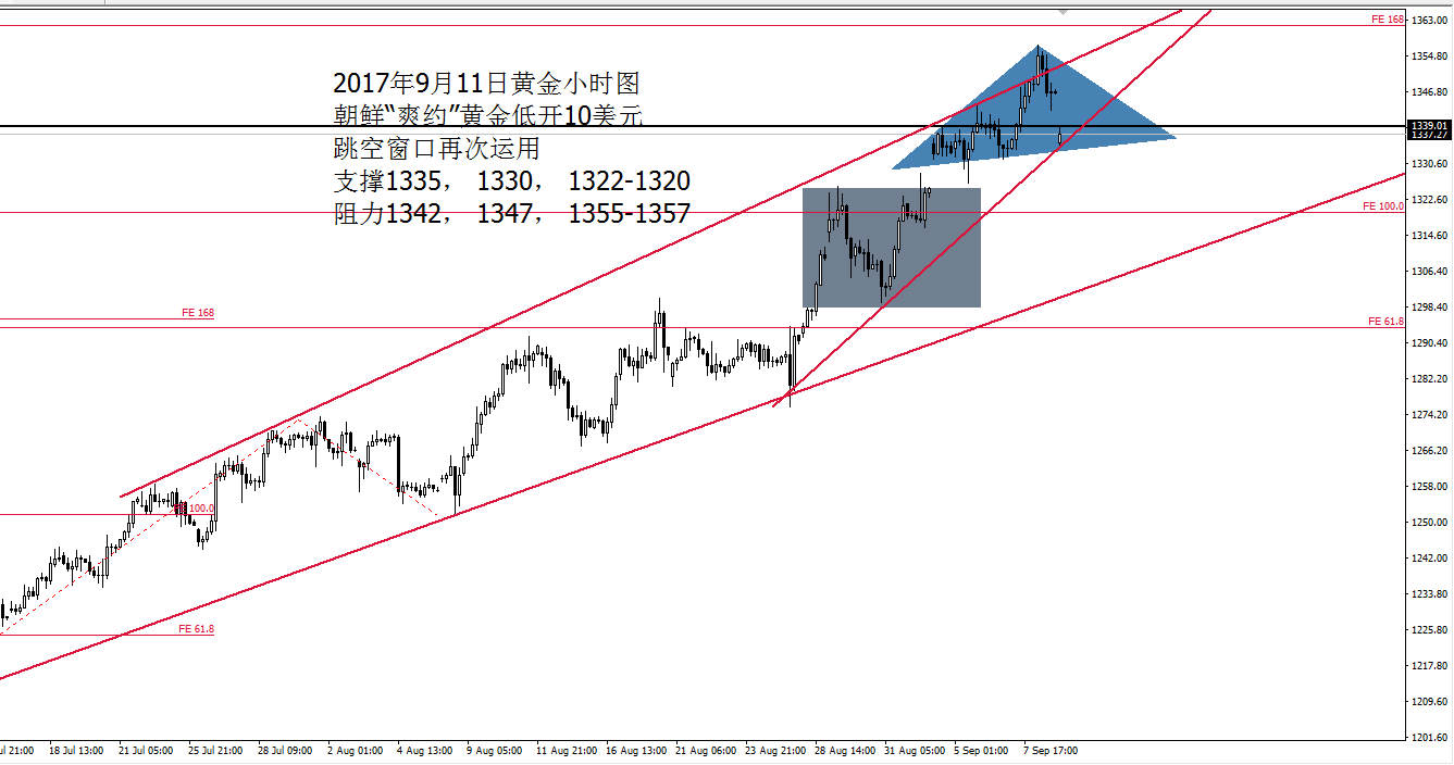 Anna点解:09.11黄金低开跳空强势震荡,原油不破47.7震荡 上周黄金周初因朝鲜半岛危机升华,黄金开盘跳空高开,前半周回补跳空窗口,后半周加速上冲刷新高位1357,周五再现涨多少跌多少局面。上周周末朝鲜国庆,万众期待的导弹没有出现,朝鲜的爽约领黄金市场避险性骤降,今日开盘跳空低开10美元。 前半周回补跳空窗口,后半