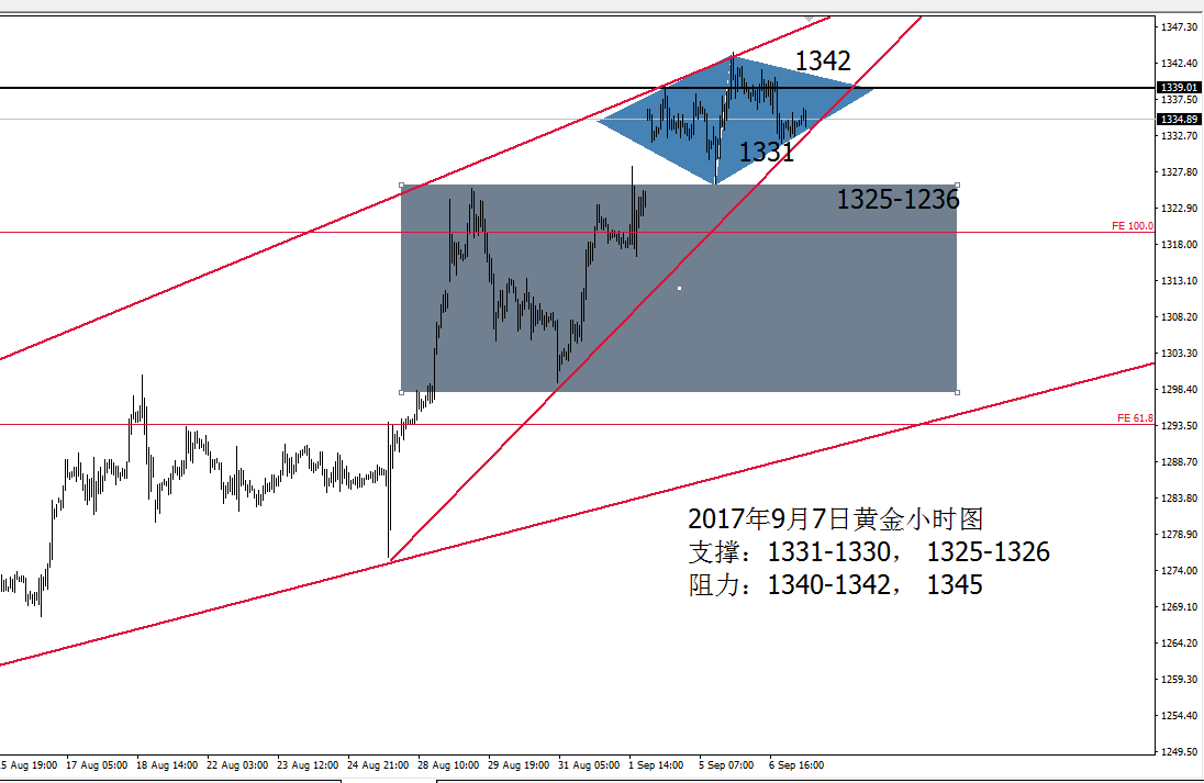 Anna点解:09.07黄金阴阳交替震荡操作,原油静待EIA报到 周三黄金白盘承压1342回落,欧盘破位凌晨回踩支撑位置1337-1338,晚间时段因美联储副主席费希尔递交辞呈美元承压,黄金快速拉升反弹,仍是承压受阻1342关口,午夜前仅仅3美元震荡调整,美盘过后走震荡回落,午夜过后加速下跌,最低触及1331一线。 前一日加速拉升,次