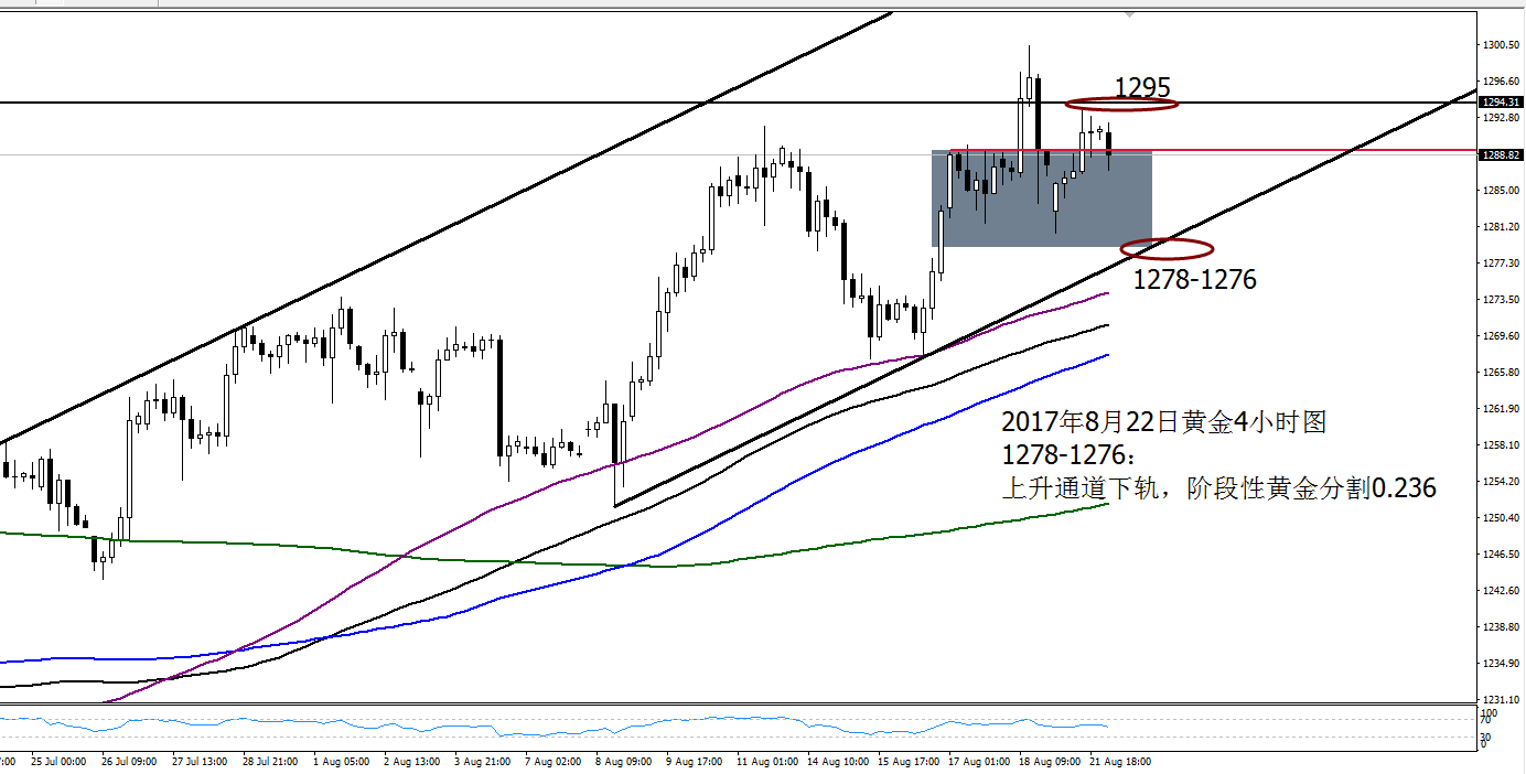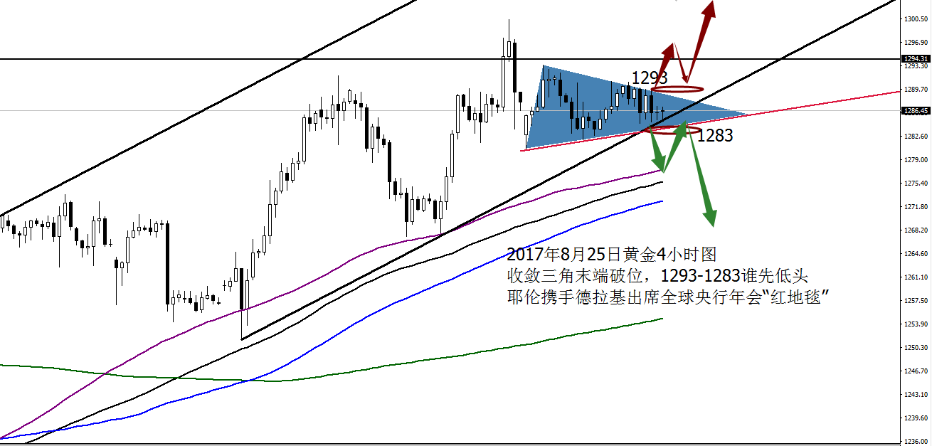 Anna点解:08.25黄金1285支撑待破位,原油区间震荡 周四黄金早盘承压1291回落,欧盘震荡延续下跌至1284.5,美盘围绕1290-1285区间来回震荡,尾盘1287-1285震荡收盘。 亚盘承压回落,欧盘延续刷新日内低点,美盘上不破,下不破,走震荡。 压轴大戏杰克逊霍尔央行年会隆重登场,今晚22点美联储主席耶伦将就金融稳定性发表讲话