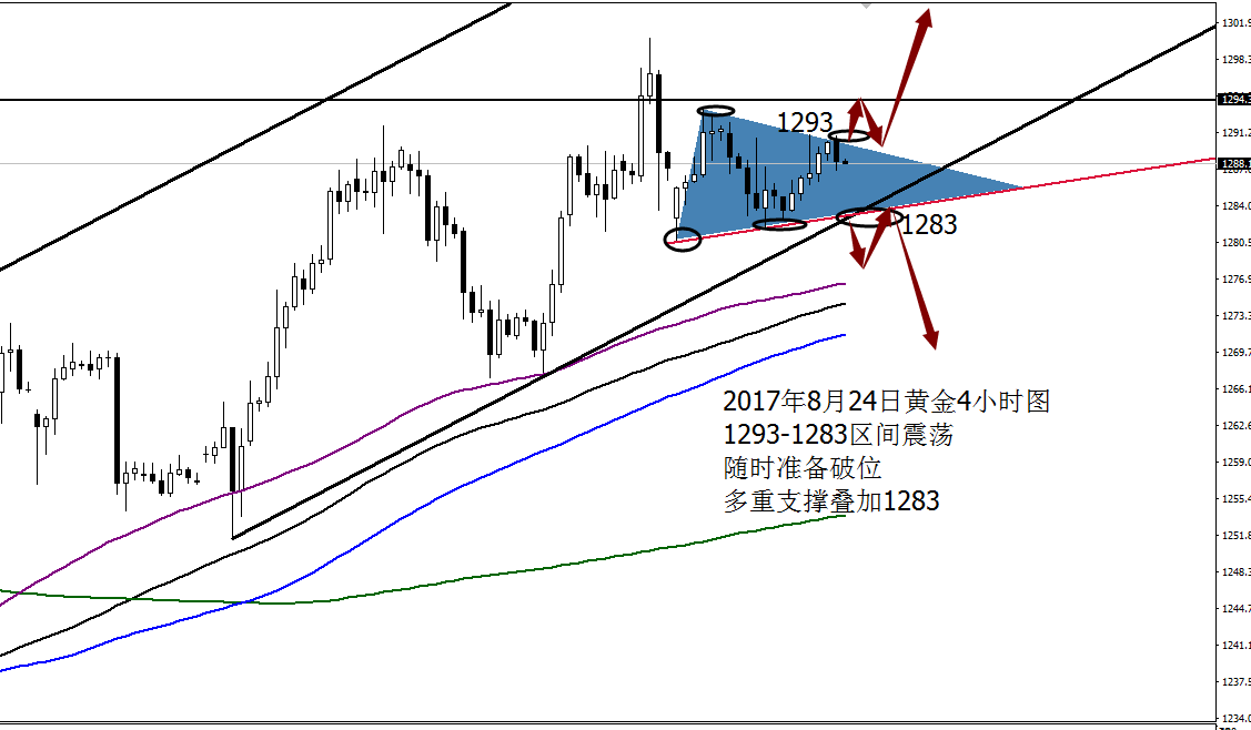 Anna点解:08.24黄金空单持有看布林带,原油白盘续涨加速 周三黄金再次走震荡调整,早间延续前一日凌晨续跌,承压1285-1286一线,欧盘延续并向上破位1286,美盘前围绕1286做调整,小时图连阳反弹并成功上破1300形成的压力线,美盘过后,黄金围绕1286-1291震荡调整。 亚盘续跌反弹,欧盘延续并破日内高点,美盘延续仍有一涨。