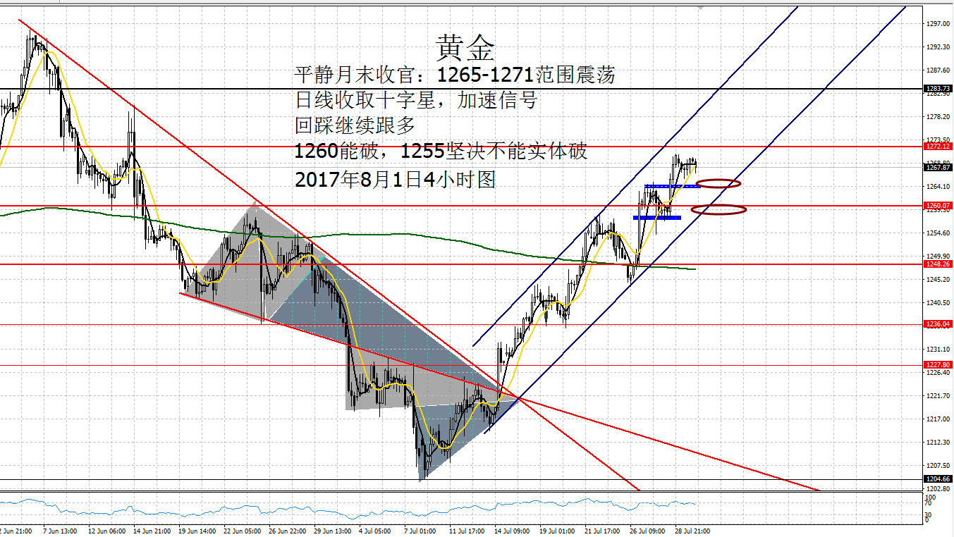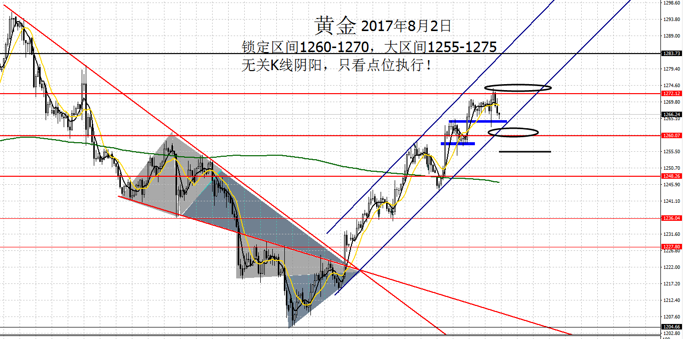 Anna点解:08.04非农再现时间拐点规律,无关数据,只看趋势 周四早盘反弹确定阻力1267,快速下跌10美元触及1257,下破小时图上升通道线,反弹承压1264布局空单,欧盘时段延续跌势,最低触及1260,窄幅震荡,美盘筑底1260开启反涨,再次宣告并未单边,仅是震荡。 亚盘急跌,欧盘震荡不破底,美盘探底回升走震荡。 昨日英国宣