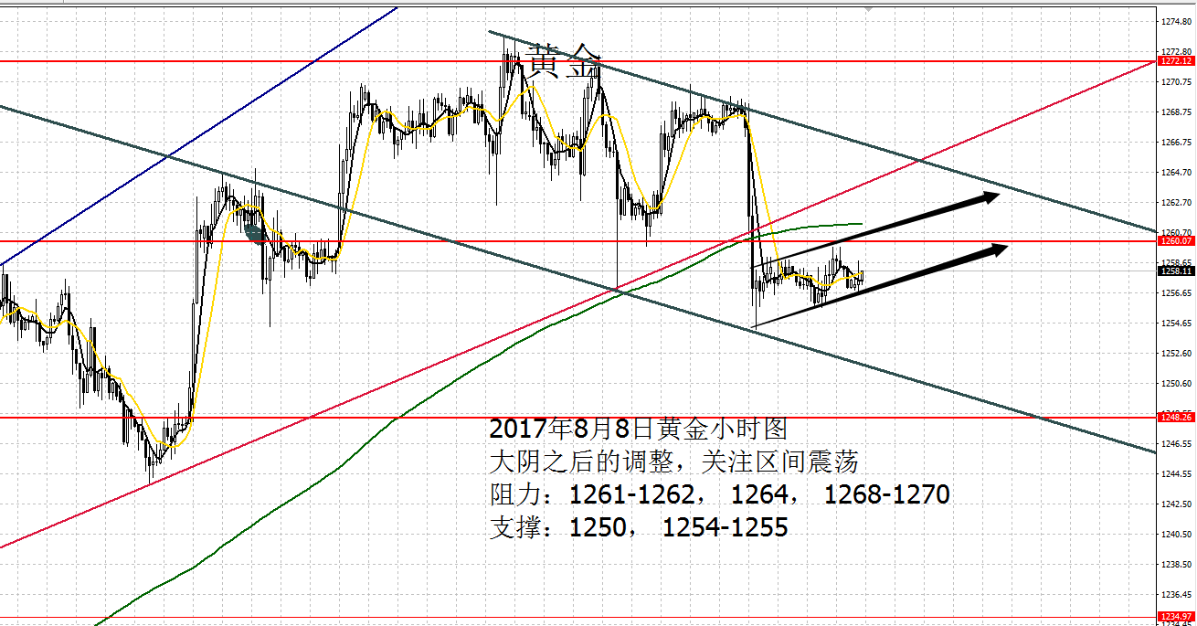 Anna点解:08.08黄金1264以下做空,原油破位随时待命 周一黄金窄幅震荡,白盘震荡幅度仅有3美元,反复测试1259阻力,并在欧盘下破支撑1257触及1255.6,即使美盘开盘也为改变3美元的震荡区间,午夜震荡走高触及1260仍是陷入1256-1260的区间震荡收盘。 大阴之后的震荡调整,时间换取空间。 黄金大阴之后窄幅震荡调整,完成对第