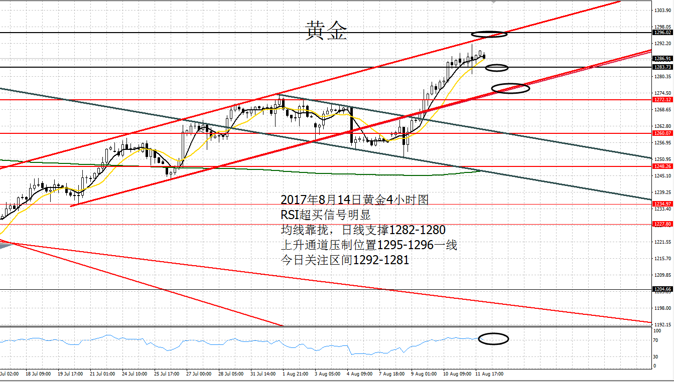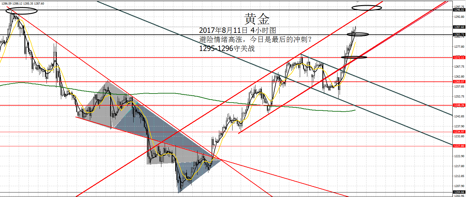 Anna点解:08.11黄金黑色星期五加速1295,原油防守48.1 周四黄金延续前一日涨势,早盘开盘1275一线直接拉升,欧盘承压1280走震荡调整,晚间时段直接突破1280,回踩1280加速上冲1287,午夜时间回落1284确定支撑,今日早盘开盘刷新1288.59的新点。特朗普效应,2天时间上涨空间37美元。 亚盘延续涨势,欧盘破新高,美盘回踩继续