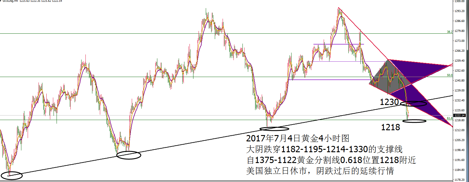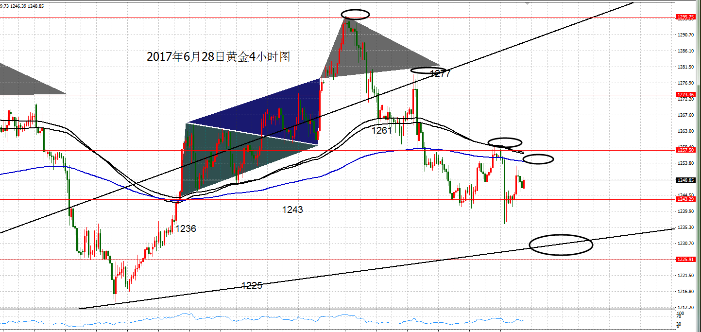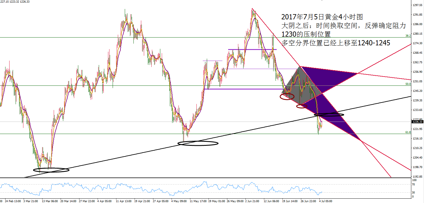 Anna点解:7月4日黄金承压1225继续看跌,原油回踩46.5接多 周一黄金开盘测试1242开始走慢牛阴跌,几乎无反弹下跌,打破支撑线1240,冲刺加速线1230,最终刷新1218的低点位置,全天累计下跌24美元。 亚盘下跌,欧盘延续,美盘再创新低。 黄金 与上周一的胖手指事件走出同速雷同的行情,节奏上却打得比较慢,以一根大阴K线直